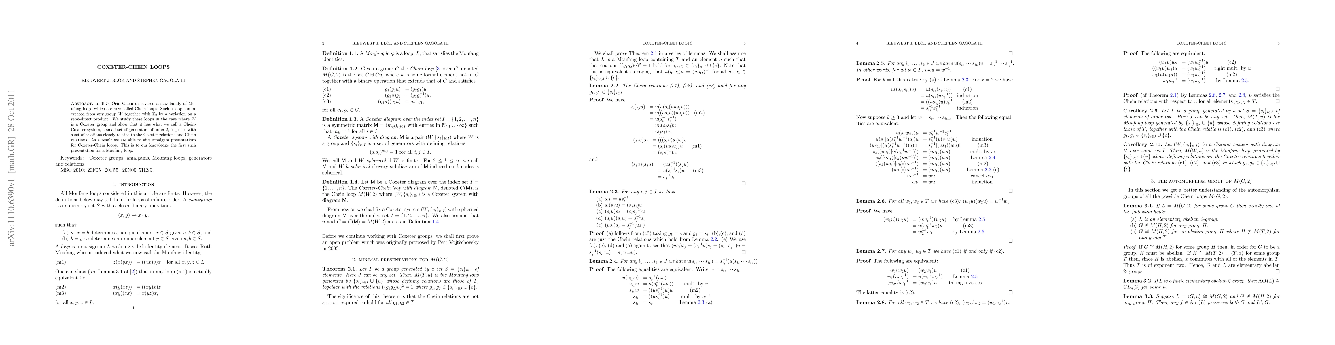 This paper explores Chein loops derived from Coxeter groups, establishing a Chein-Coxeter system with generators of order 2 and relations tied to Coxeter and Chein relations, leading to the first known amalgam presentations for Coxeter-Chein loops.