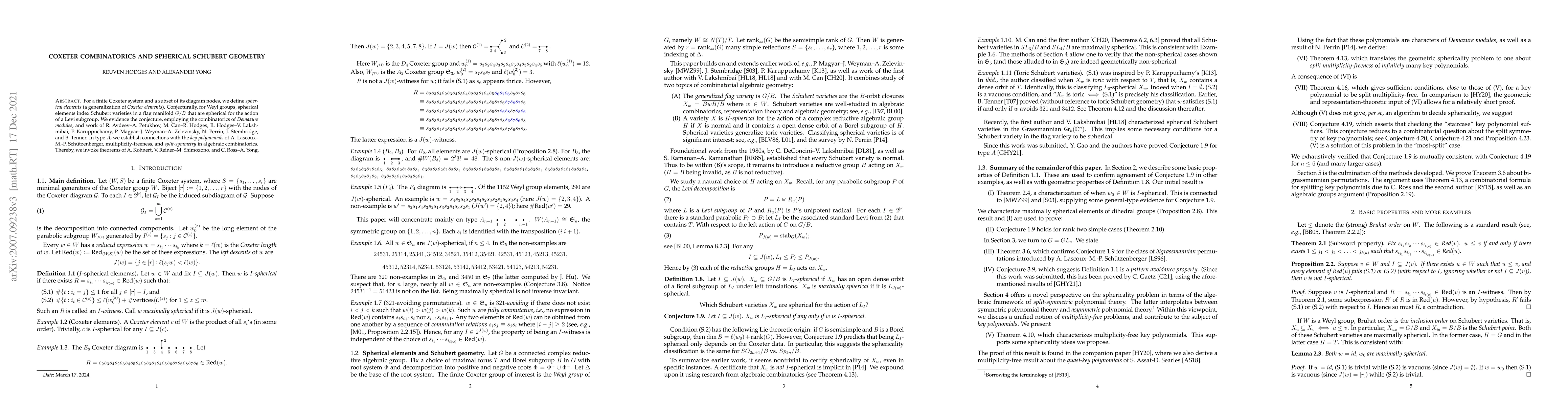 This paper explores the relationship between Coxeter combinatorics and spherical Schubert geometry, proposing that spherical elements generalize Coxeter elements and index Schubert varieties in flag manifolds. The authors provide evidence for this conjecture using Demazure modules and contributions from various researchers, establishing connections to algebraic combinatorics and multiplicity-freeness.