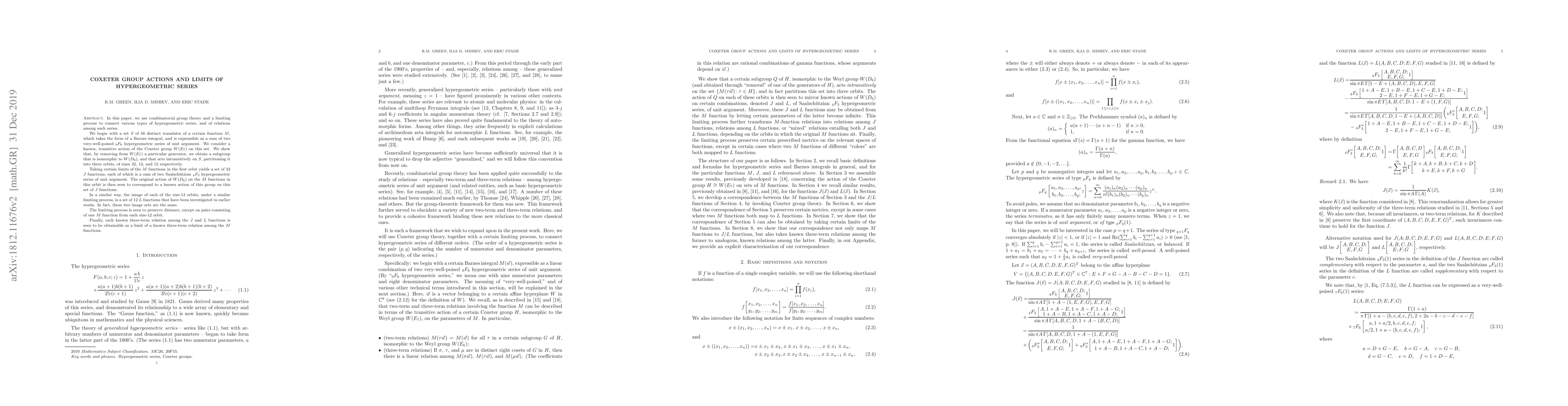 In this paper, we use combinatorial group theory and a limiting process to connect various types of hypergeometric series, and of relations among such series. We begin with a set $S$ of 56 distinct translates of a certain function $M$, which takes the form of a Barnes integral, and is expressible as a sum of two very-well-poised $_9F_8$ hypergeometric series of unit argument. We consider a known, transitive action of the Coxeter group $W(E_7)$ on this set. We show that, by removing from $W(E_7)$ a particular generator, we obtain a subgroup that is isomorphic to $W(D_6)$, and that acts intransitively on $S$, partitioning it into three orbits, of sizes 32, 12, and 12 respectively. Taking certain limits of the $M$ functions in the first orbit yields a set of 32 $J$ functions, each of which is a sum of two Saalsch\"utzian $_4F_3$ hypergeometric series of unit argument. The original action of $W(D_6)$ on the $M$ functions in this orbit is then seen to correspond to a known action of this group on this set of $J$ functions. In a similar way, the image of each of the size-12 orbits, under a similar limiting process, is a set of 12 $L$ functions that have been investigated in earlier works. In fact, these two image sets are the same. The limiting process is seen to preserve distance, except on pairs consisting of one $M$ function from each size-12 orbit. Finally, each known three-term relation among the $J$ and $L$ functions is seen to be obtainable as a limit of a known three-term relation among the $M$ functions.