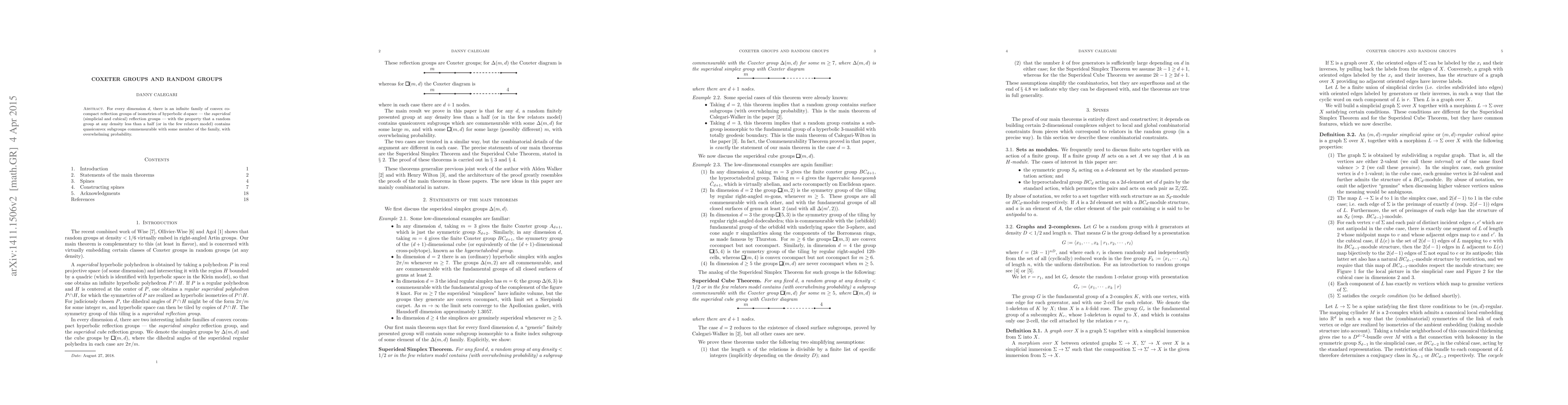 A study on Coxeter groups and random groups found that there is an infinite family of convex co-compact reflection groups in hyperbolic space, which can generate subgroups with high probability as the density decreases.