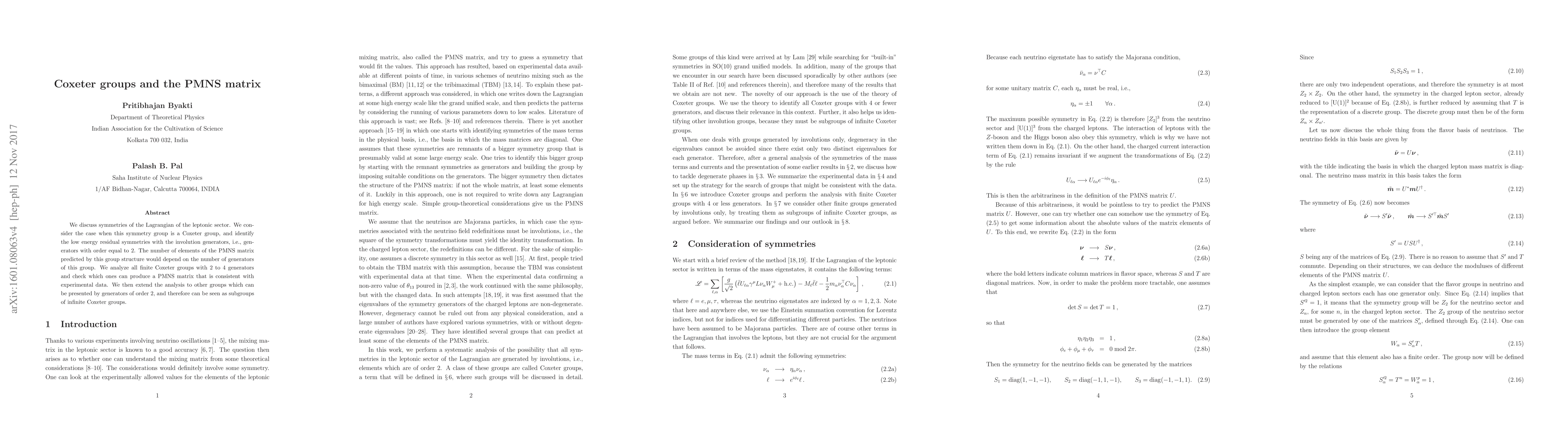We discuss the symmetries of the Lagrangian of the leptonic sector. We consider the case when this symmetry group is a Coxeter group. The number of elements of the PMNS matrix predicted by this group structure would depend on the number of generators of this group. We analyze finite Coxeter groups with 2 to 4 generators and even finite subgroups of infinite Coxeter groups with 4 generators and show which of them can give results that are consistent with experimental data.