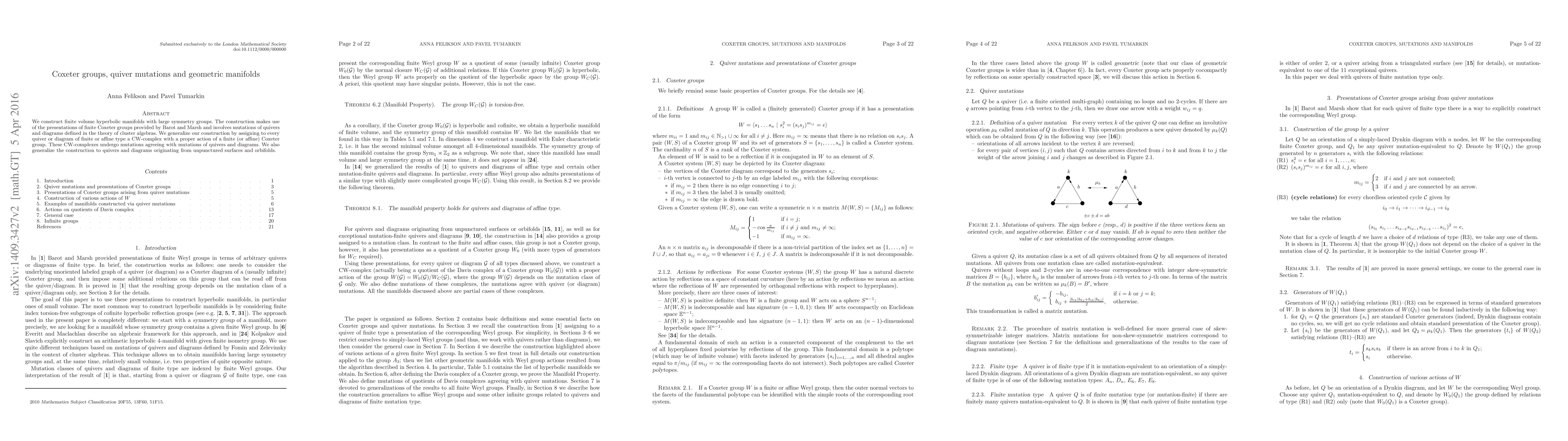 This paper constructs finite volume hyperbolic manifolds with significant symmetry by utilizing Coxeter groups and quiver mutations from cluster algebra theory. It generalizes the approach to apply to quivers and diagrams from unpunctured surfaces and orbifolds, establishing CW-complexes with proper Coxeter group actions.