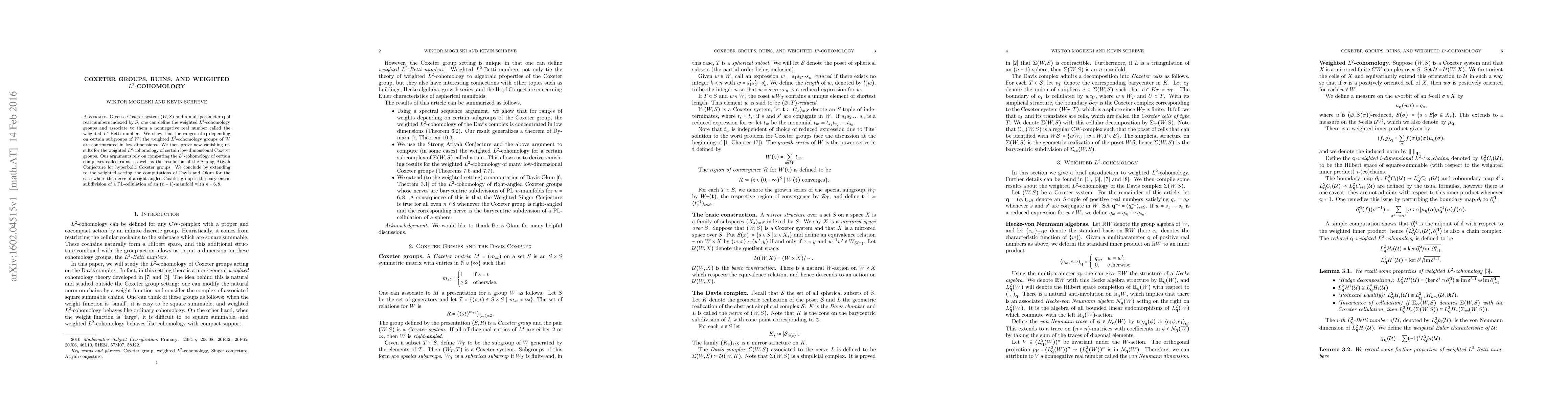 This paper investigates the weighted $L^2$-cohomology groups associated with Coxeter systems, demonstrating concentration in low dimensions under specific parameter ranges. It proves new vanishing results for certain low-dimensional Coxeter groups, relying on the $L^2$-cohomology of ruins and the resolution of the Strong Atiyah Conjecture.