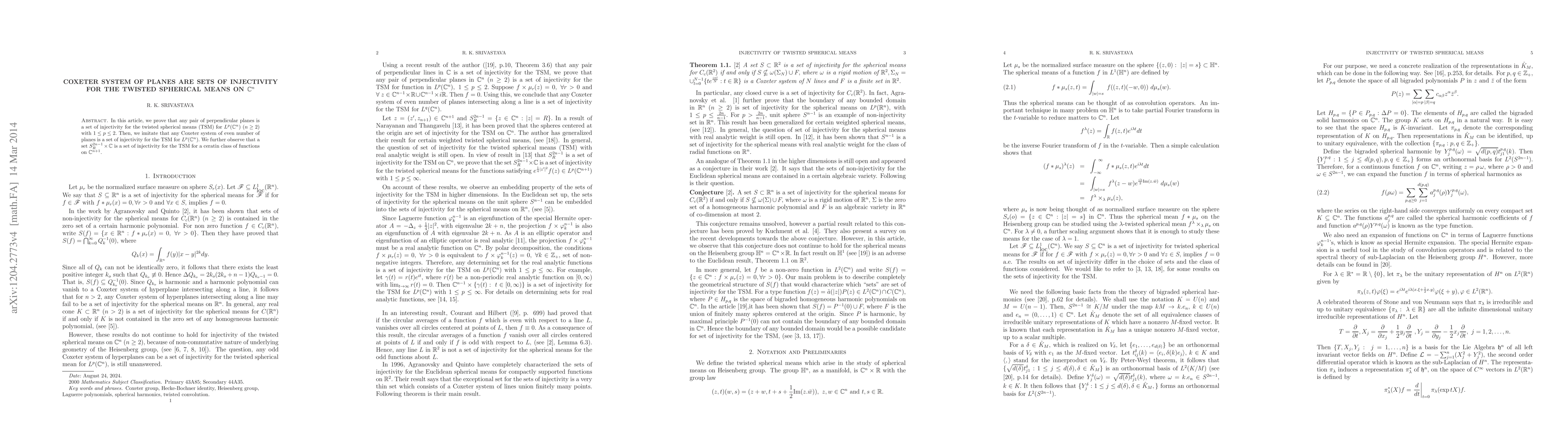 This paper proves that perpendicular planes in $\mathbb C^n$ are sets of injectivity for twisted spherical means in $L^p$ spaces, and extends this to Coxeter systems with an even number of planes. Additionally, it shows that certain cylindrical sets in $\mathbb C^{n+1}$ are also injective sets for a specific class of functions.