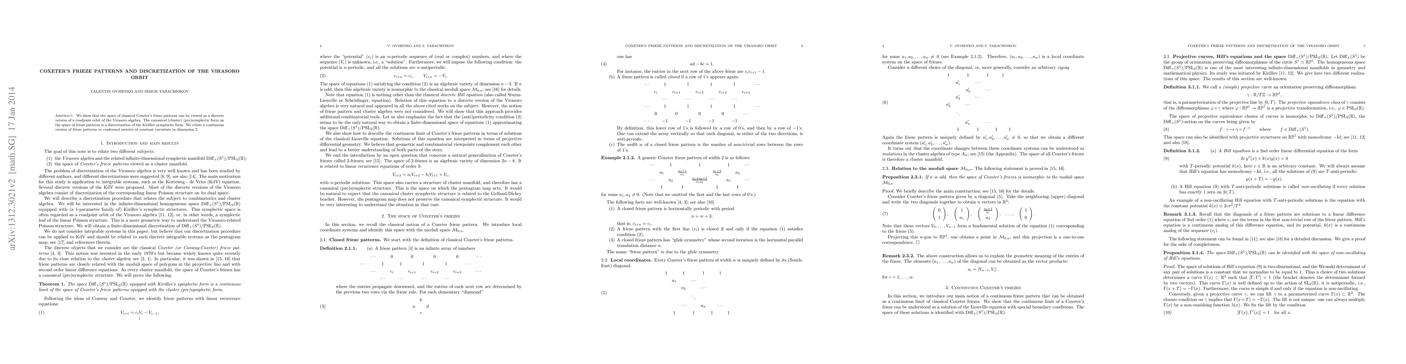 Researchers show that Coxeter's frieze patterns can be seen as a discrete version of a coadjoint orbit of the Virasoro algebra, relating them to conformal metrics in dimension 2.