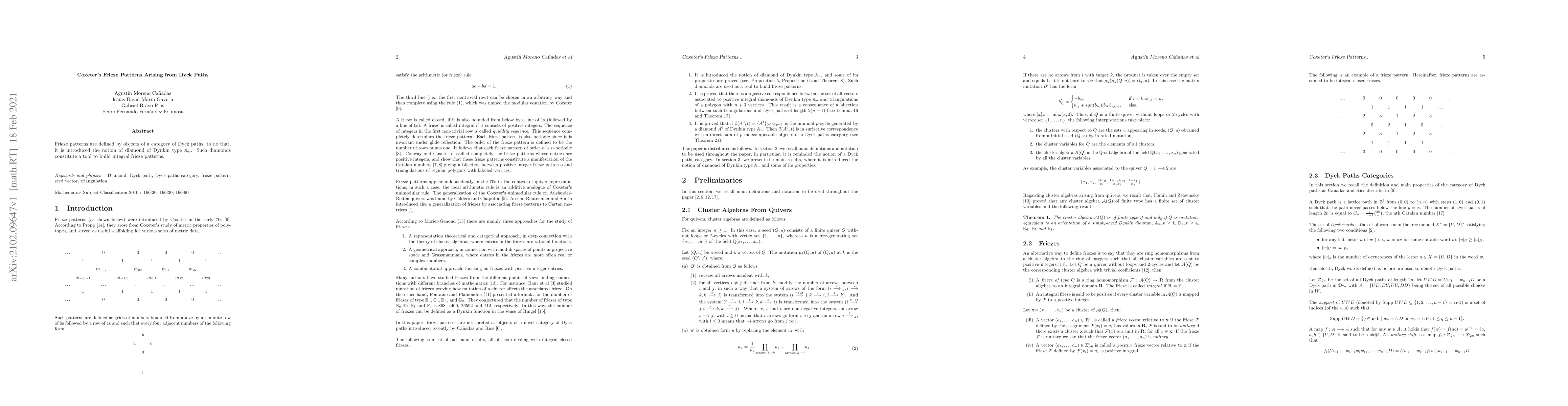 Frieze patterns are defined by objects of a category of Dyck paths, to do that, it is introduced the notion of diamond of Dynkin type An. Such diamonds constitute a tool to build integral frieze patterns.