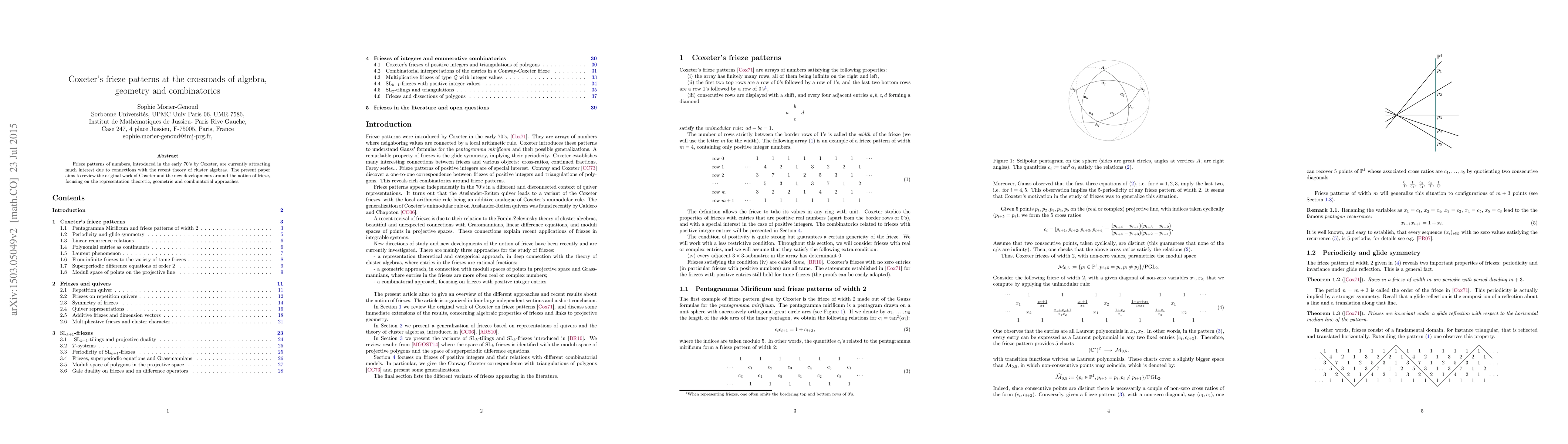 This paper reviews Coxeter's frieze patterns and their connections to algebra, geometry, and combinatorics, highlighting recent developments in cluster algebras. It explores representation theory, geometric, and combinatorial approaches to understanding the significance of these patterns.