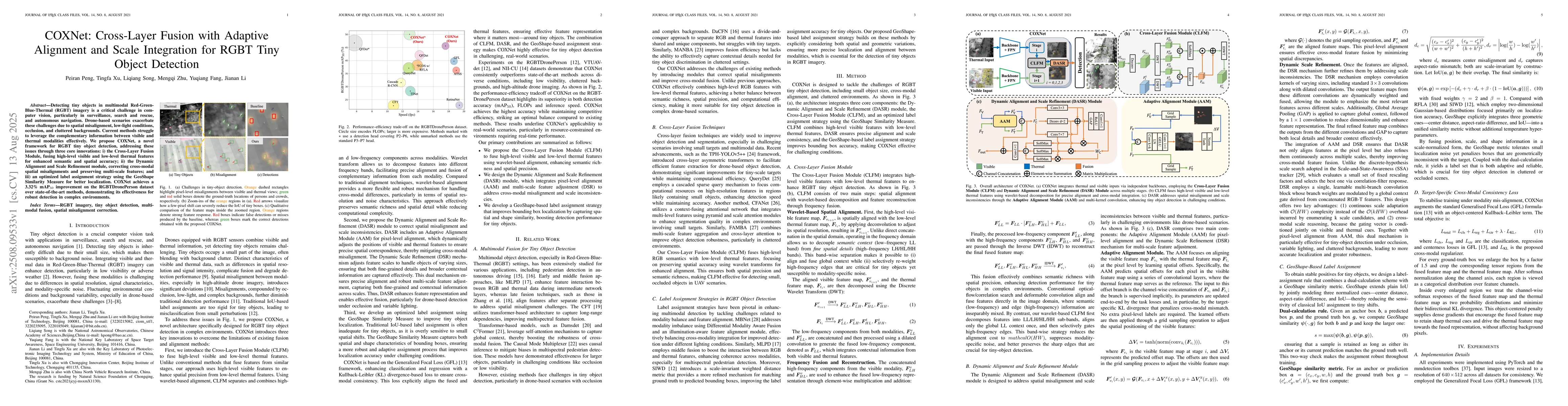 Detecting tiny objects in multimodal Red-Green-Blue-Thermal (RGBT) imagery is a critical challenge in computer vision, particularly in surveillance, search and rescue, and autonomous navigation. Drone-based scenarios exacerbate these challenges due to spatial misalignment, low-light conditions, occlusion, and cluttered backgrounds. Current methods struggle to leverage the complementary information between visible and thermal modalities effectively. We propose COXNet, a novel framework for RGBT tiny object detection, addressing these issues through three core innovations: i) the Cross-Layer Fusion Module, fusing high-level visible and low-level thermal features for enhanced semantic and spatial accuracy; ii) the Dynamic Alignment and Scale Refinement module, correcting cross-modal spatial misalignments and preserving multi-scale features; and iii) an optimized label assignment strategy using the GeoShape Similarity Measure for better localization. COXNet achieves a 3.32\% mAP$_{50}$ improvement on the RGBTDronePerson dataset over state-of-the-art methods, demonstrating its effectiveness for robust detection in complex environments.