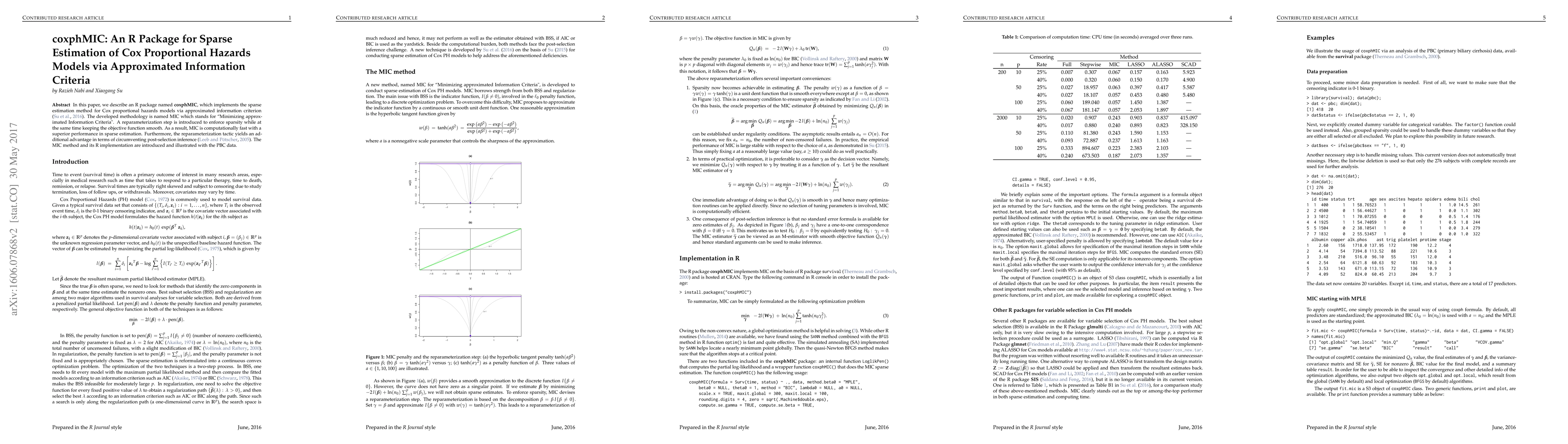 The paper introduces coxphMIC, an R package for sparse estimation in Cox proportional hazards models using the MIC method, which minimizes an approximated information criterion. The MIC method employs a reparameterization to enforce sparsity and improve computational efficiency, while also avoiding post-selection inference issues.