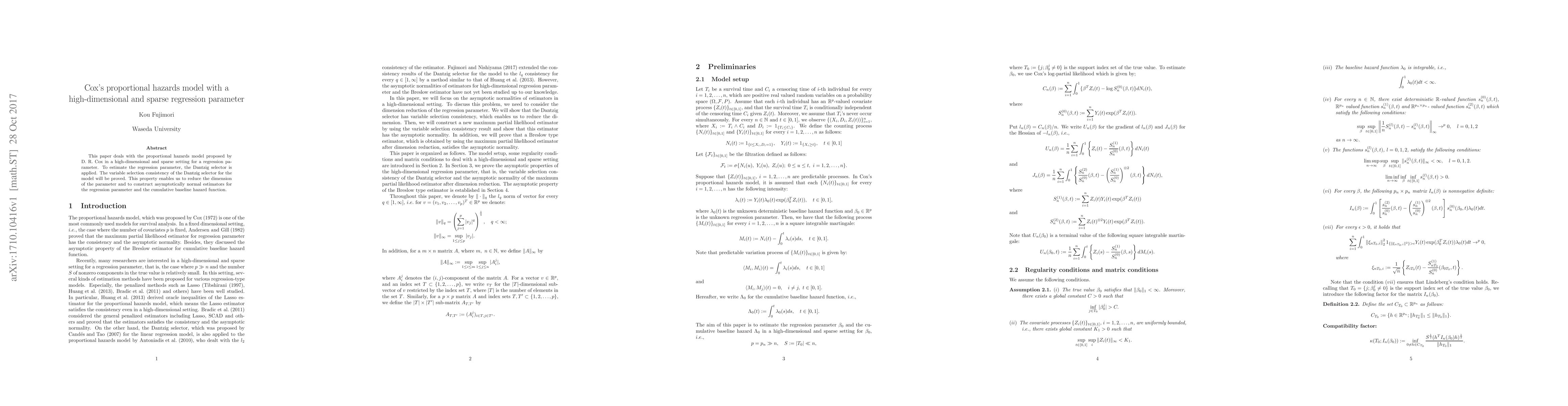 This paper explores Cox's proportional hazards model in high-dimensional and sparse settings, employing the Dantzig selector for parameter estimation. It proves the variable selection consistency of the Dantzig selector, enabling dimension reduction and the construction of asymptotically normal estimators.
