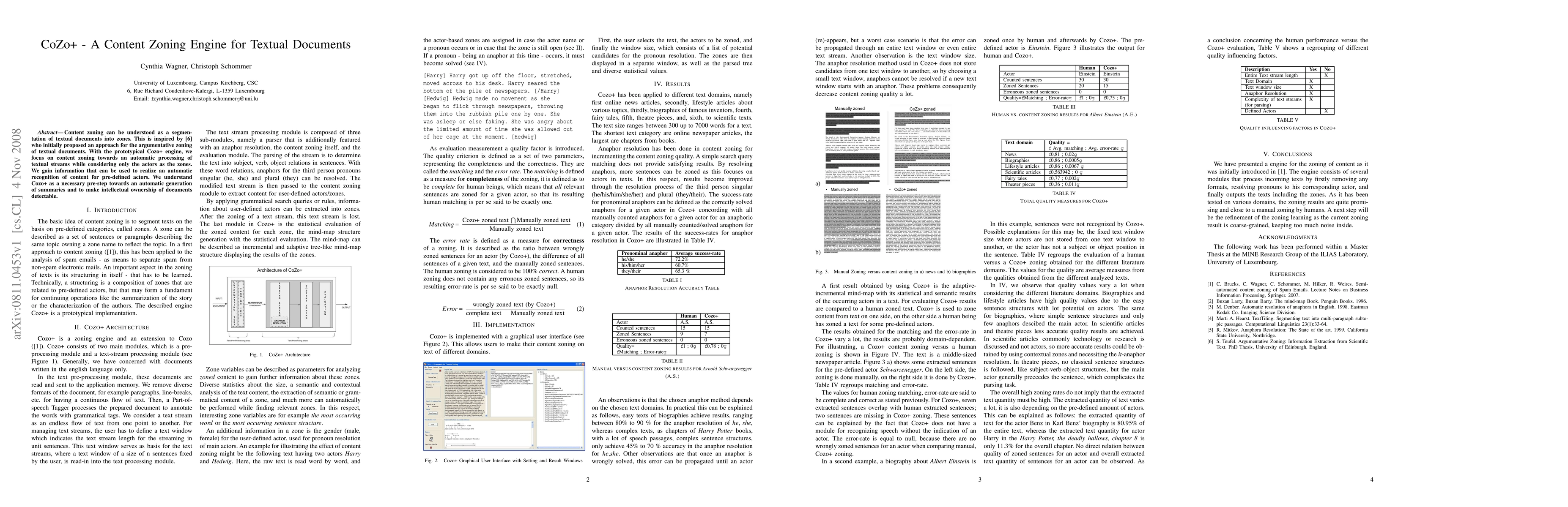 Content zoning can be understood as a segmentation of textual documents into zones. This is inspired by [6] who initially proposed an approach for the argumentative zoning of textual documents. With the prototypical CoZo+ engine, we focus on content zoning towards an automatic processing of textual streams while considering only the actors as the zones. We gain information that can be used to realize an automatic recognition of content for pre-defined actors. We understand CoZo+ as a necessary pre-step towards an automatic generation of summaries and to make intellectual ownership of documents detectable.