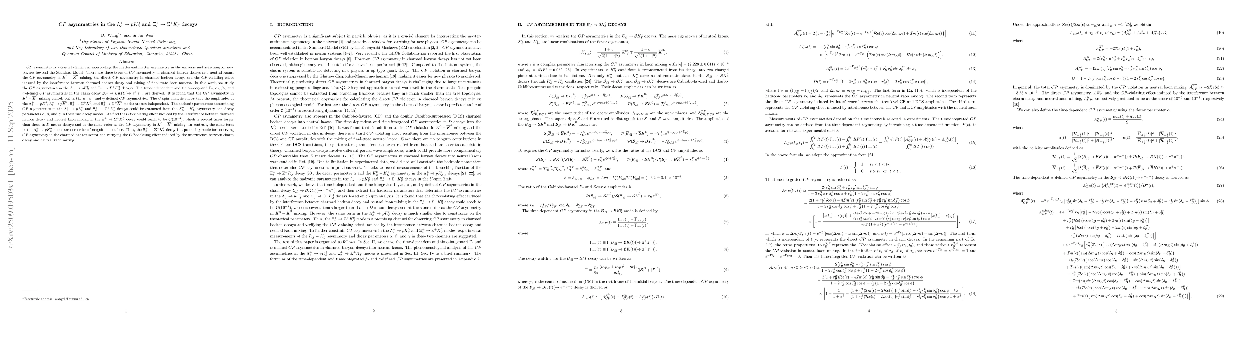 $CP$ asymmetry is a crucial element in interpreting the matter-antimatter asymmetry in the universe and searching for new physics beyond the Standard Model. In this work, we study the $CP$ asymmetries in the $\Lambda_c^+\to pK^0_S$ and $\Xi^+_c\to \Sigma^+K^0_S$ decays. The time-independent and time-integrated $\Gamma$-, $\alpha$-, $\beta$-, and $\gamma$-defined $CP$ asymmetries in the chain decay $\mathcal{B}_{c\overline 3}\to \mathcal{B}K(t)(\to \pi^{+}\pi^{-})$ are derived. It is found that the $CP$ asymmetry in $K^0-\overline K^0$ mixing cancels out in the $\alpha$-, $\beta$-, and $\gamma$-defined $CP$ asymmetries. The $U$-spin analysis shows that the amplitudes of the $\Lambda_c^+\to pK^0$, $\Lambda_c^+\to p\overline K^0$, $\Xi^+_c\to \Sigma^+ K^0$, and $\Xi^+_c\to \Sigma^+ \overline K^0$ modes are not independent. The hadronic parameters determining $CP$ asymmetries in the $\Lambda_c^+\to pK^0_S$ and $\Xi^+_c\to \Sigma^+K^0_S$ decays could be extracted from the $K^0_S-K^0_L$ asymmetry and decay parameters $\alpha$, $\beta$, and $\gamma$ in these two decay modes. We find the $CP$-violating effect induced by the interference between charmed hadron decay and neutral kaon mixing in the $\Xi^+_c\to \Sigma^+ K^0_S$ decay could reach to be $\mathcal{O}(10^{-3})$, which is several times larger than those in $D$ meson decays and at the same order as the $CP$ asymmetry in $K^0-\overline K^0$ mixing. In contrast, the same term in the $\Lambda_c^+\to pK^0_S$ mode are one order of magnitude smaller. Thus, the $\Xi^+_c\to \Sigma^+ K^0_S$ decay is a promising mode for observing $CP$ asymmetry in the charmed hadron sector and verifying the $CP$-violating effect induced by the interference between charm decay and neutral kaon mixing.