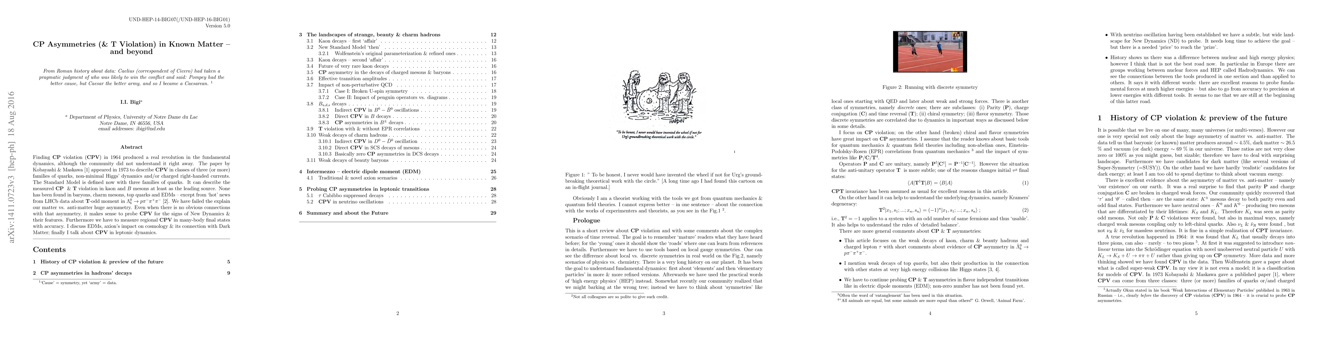This paper explores CP violation (\CPV) and T-violation in known matter, highlighting the Standard Model's success in describing \CPV in kaons and B mesons while noting the absence of such phenomena in baryons and other particles. It also discusses the potential for new dynamics beyond the Standard Model and the importance of measuring \CPV in complex final states.