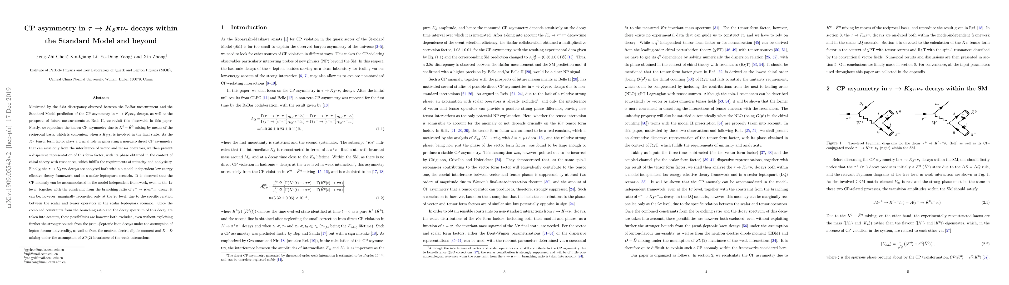 Motivated by the $2.8\sigma$ discrepancy observed between the BaBar measurement and the Standard Model prediction of the CP asymmetry in $\tau\to K_S\pi\nu_\tau$ decays, as well as the prospects of future measurements at Belle II, we revisit this observable in this paper. Firstly, we reproduce the known CP asymmetry due to $K^0 -\bar{K}^0$ mixing by means of the reciprocal basis, which is convenient when a $K_{S(L)}$ is involved in the final state. As the $K\pi$ tensor form factor plays a crucial role in generating a non-zero direct CP asymmetry that can arise only from the interference of vector and tensor operators, we then present a dispersive representation of this form factor, with its phase obtained in the context of chiral theory with resonances, which fulfills the requirements of unitarity and analyticity. Finally, the $\tau\to K_S\pi\nu_\tau$ decays are analyzed both within a model-independent low-energy effective theory framework and in a scalar leptoquark scenario. It is observed that the CP anomaly can be accommodated in the model-independent framework, even at the $1\sigma$ level, together with the constraint from the branching ratio of $\tau^-\to K_S\pi^-\nu_\tau$ decay; it can be, however, marginally reconciled only at the $2\sigma$ level, due to the specific relation between the scalar and tensor operators in the scalar leptoquark scenario. Once the combined constraints from the branching ratio and the decay spectrum of this decay are taken into account, these possibilities are however both excluded, even without exploiting further the stronger bounds from the (semi-)leptonic kaon decays under the assumption of lepton-flavour universality, as well as from the neutron electric dipole moment and $D-\bar{D}$ mixing under the assumption of $SU(2)$ invariance of the weak interactions.