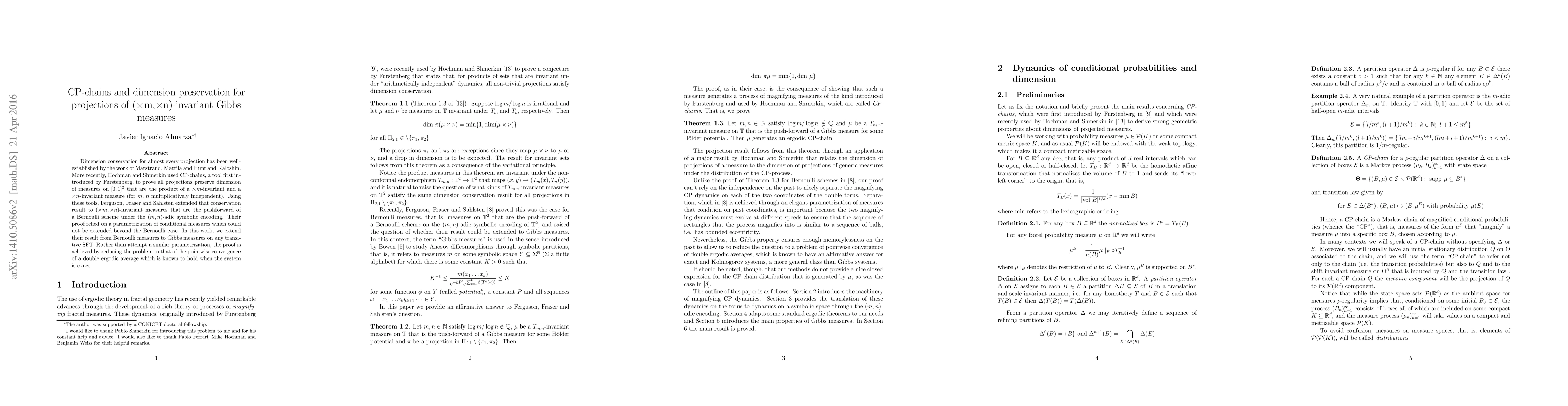 Researchers extend conservation of dimension for projections of Gibbs measures to transitive SFTs, using a double ergodic average approach rather than parametrization.