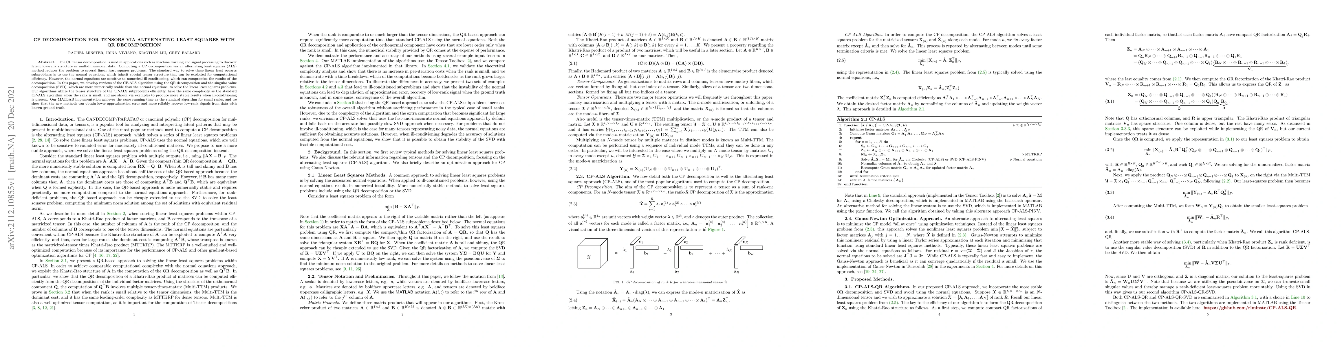 This paper proposes enhanced CP tensor decomposition methods using QR and SVD instead of normal equations to solve linear least squares subproblems, achieving greater numerical stability and lower approximation error, especially in ill-conditioned scenarios. The new algorithms maintain similar complexity for small ranks and outperform the standard CP-ALS method in stability and signal recovery.