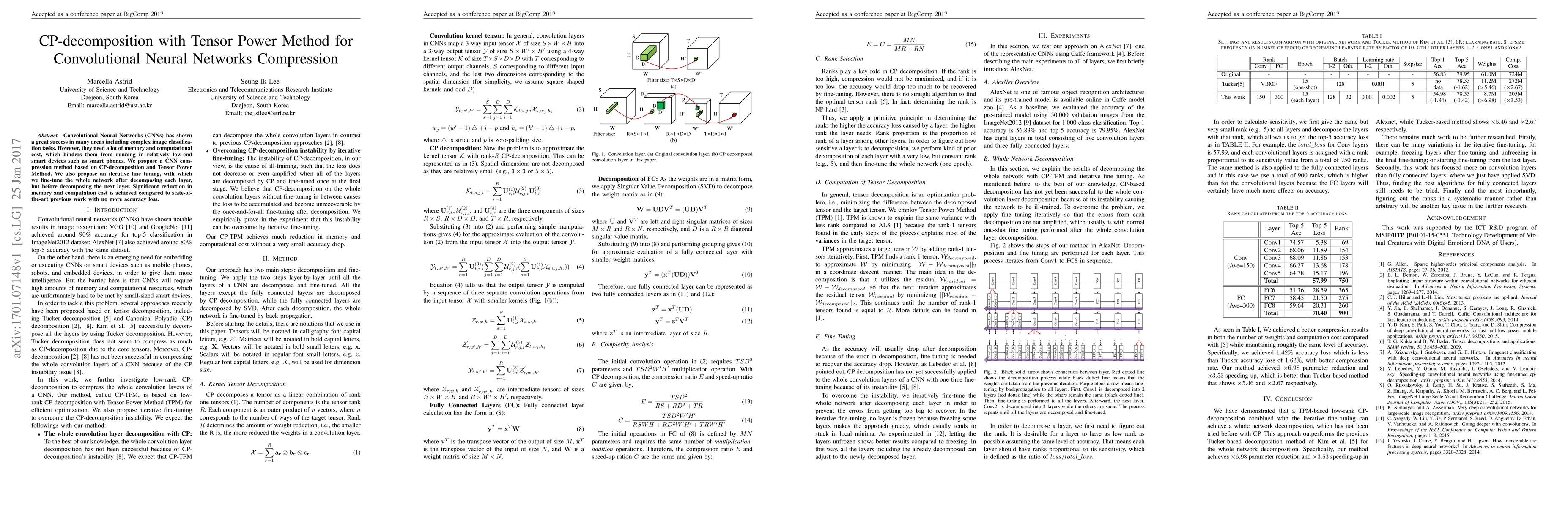 This paper proposes a CNN compression method using CP-decomposition and Tensor Power Method, along with iterative fine-tuning, achieving significant reductions in memory and computational costs without compromising accuracy. The approach is shown to outperform existing state-of-the-art methods.