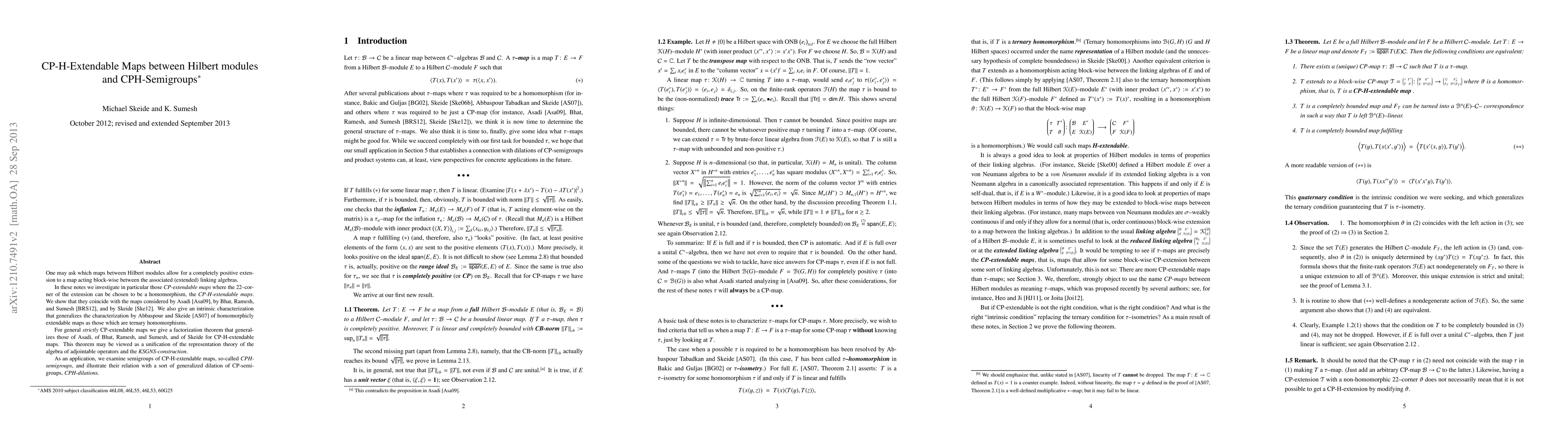 One may ask which maps between Hilbert modules allow for a completely positive extension to a map acting block-wise between the associated (extended) linking algebras. In these notes we investigate in particular those of such CP-extendable maps whose 22-corner is a homomorphism, the CP-H-extendable maps. We show that they coincide with the maps considered by Asadi [Asa09], by Bhat, Ramesh, and Sumesh [BRS12], and by Skeide [Ske10]. We also give an intrinsic characterization that generalizes the characterization by Abbaspour and Skeide [AbSk07] of homomorphicly extendable maps as those which are ternary homomorphisms. For general strictly CP-extendable maps we give a factorization theorem that generalizes those of Asadi, of Bhat, Ramesh, and Sumesh, and of Skeide for CP-H-extendable maps. As an application, we examine semigroups of CP-H-extendable maps, so-called CPH-semigroups, and illustrate their relation with a sort of generalized dilation of CP-semigroups, CPH-dilations.