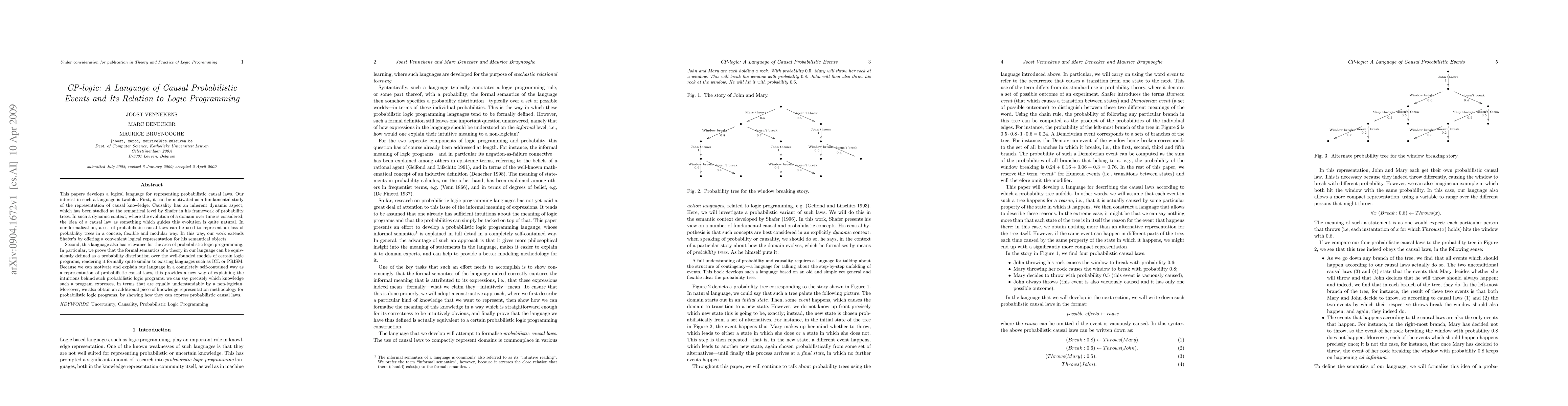 This paper introduces CP-logic, a logical language for representing probabilistic causal laws, extending Shafer's probability trees framework. It also connects CP-logic to probabilistic logic programming, showing its equivalence to a probability distribution over logic programs' well-founded models.