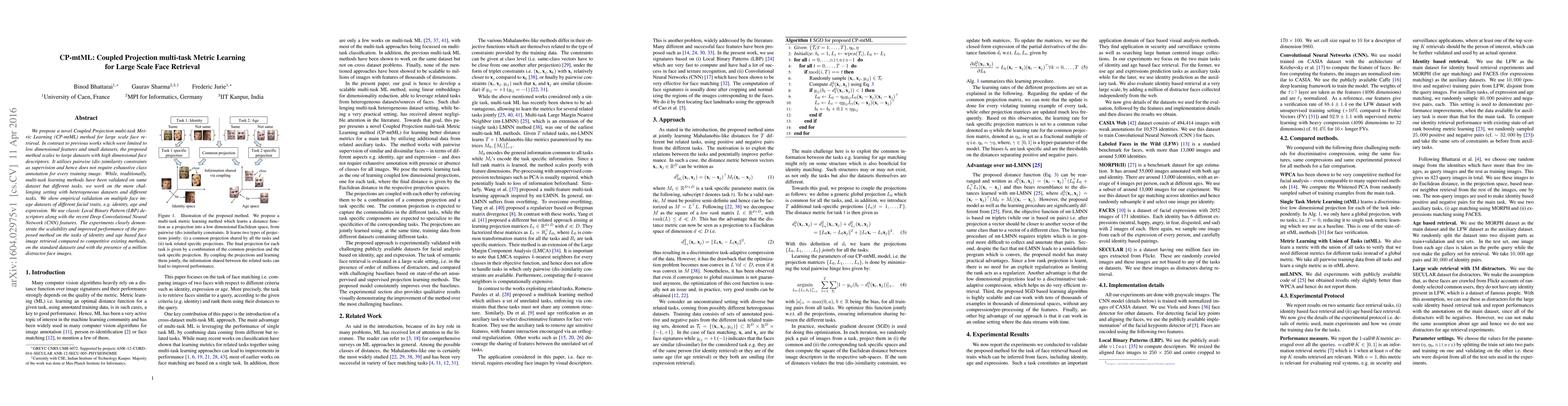 This research introduces a novel Coupled Projection multi-task Metric Learning (CP-mtML) method for large-scale face retrieval, which effectively scales to large datasets with high-dimensional face descriptors. Unlike previous methods, it leverages pairwise similarity constraints without requiring exhaustive class annotations, and demonstrates improved performance on identity and age-based face retrieval tasks across diverse datasets. For more details, please refer to the original paper.