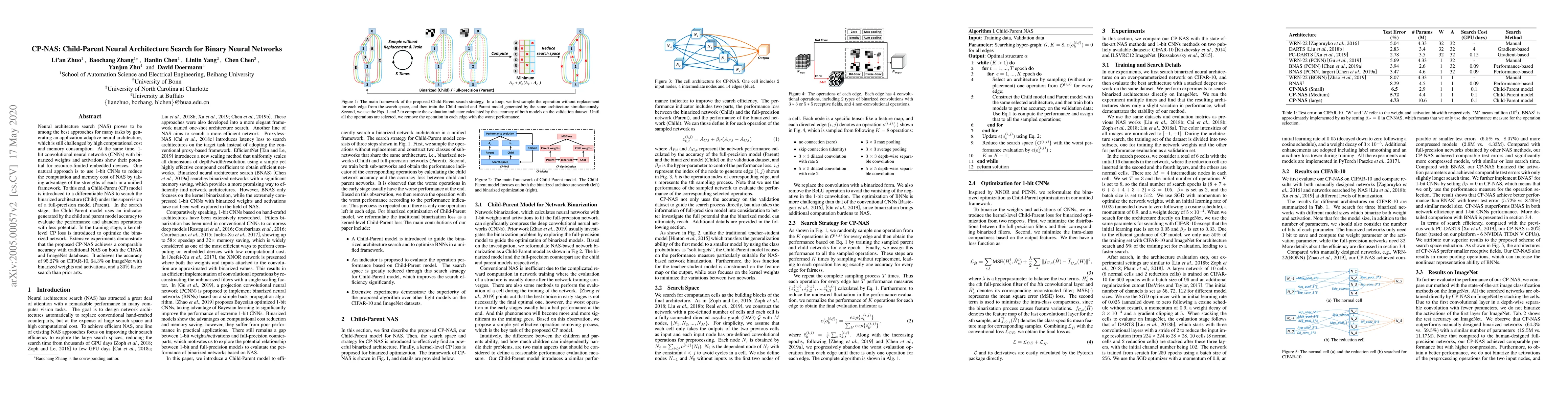 CP-NAS introduces a Child-Parent model for differentiable neural architecture search to efficiently generate binarized neural networks, achieving comparable accuracy to traditional NAS while reducing computational cost and memory consumption. The method achieves notable accuracy on CIFAR-10 and ImageNet and is 30% faster than prior methods.