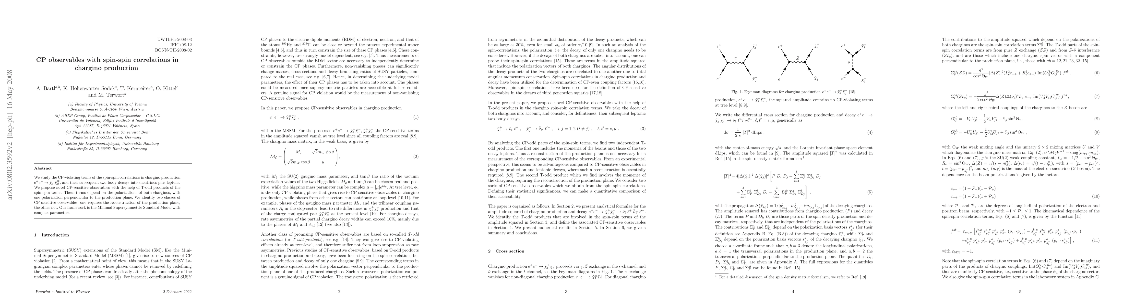 This paper investigates CP-violating effects in chargino production via spin-spin correlations in e+e- collisions, proposing novel CP-sensitive observables. It distinguishes two classes of these observables based on the necessity of production plane reconstruction.