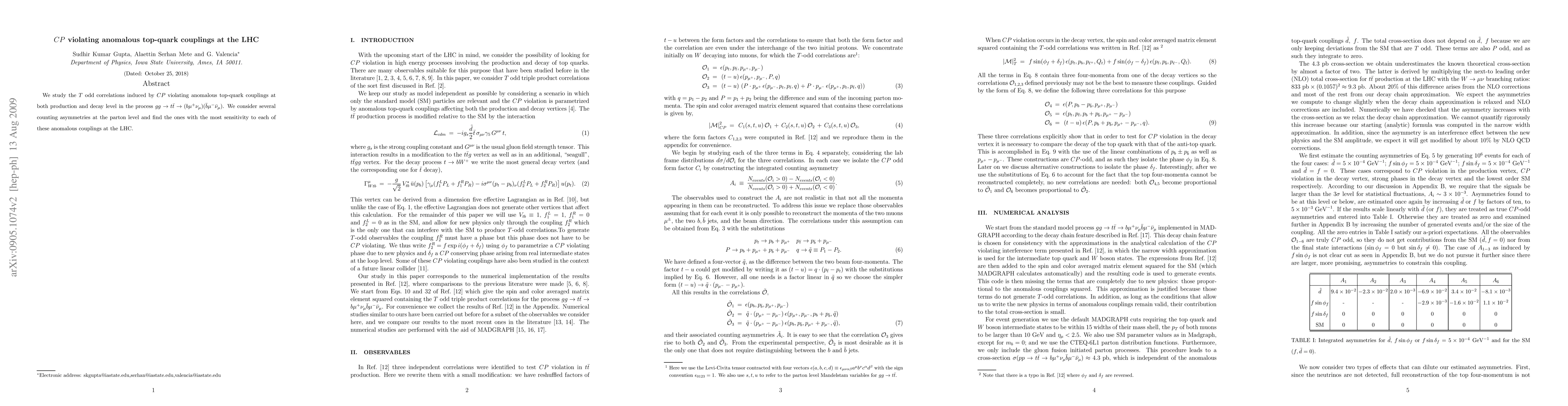 We study the T odd correlations induced by CP violating anomalous top-quark couplings at both production and decay level in the process gg --> t t_bar --> (b mu+ nu_mu) (b_bar mu- nu_mu_bar). We consider several counting asymmetries at the parton level and find the ones with the most sensitivity to each of these anomalous couplings at the LHC.