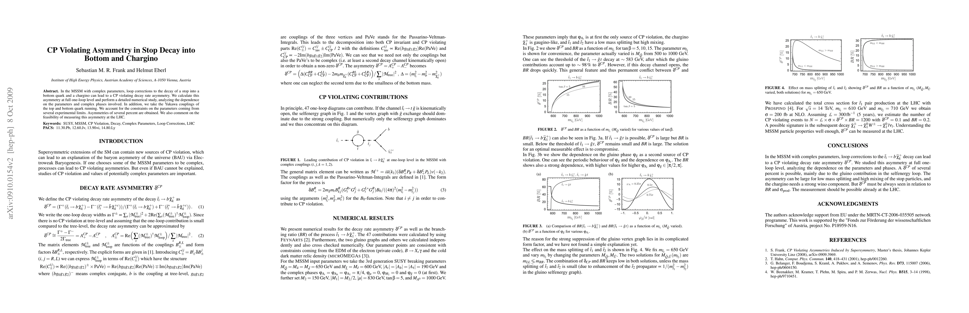 Researchers calculated CP violating asymmetry in stop decay into bottom quark and chargino at one-loop level, finding several percent asymmetries that could be measurable at the LHC with experimental limits.