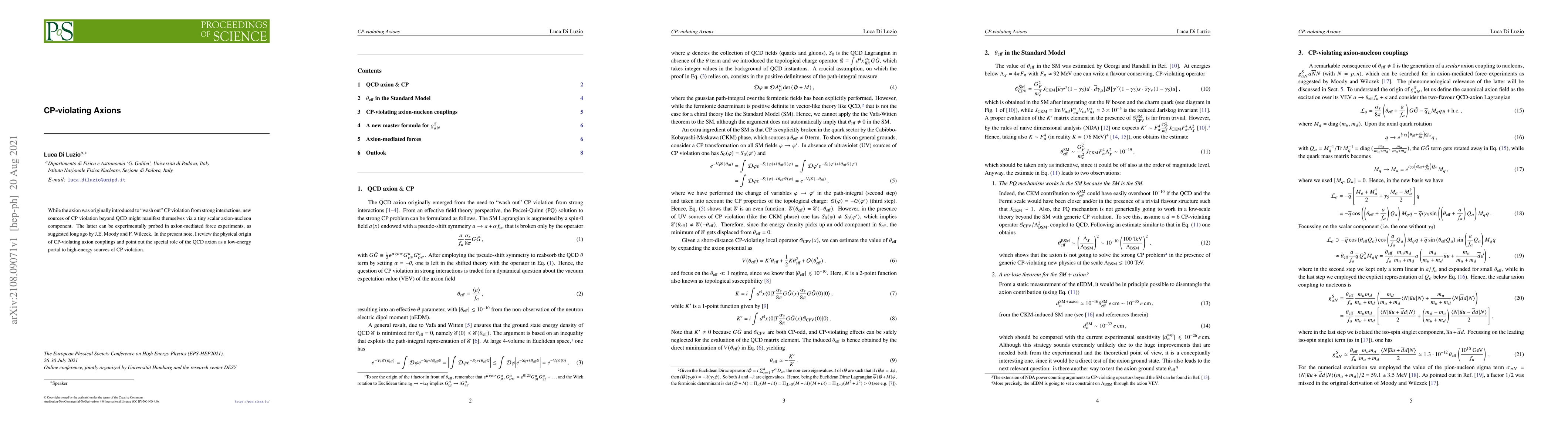 Summary: This paper reviews the physical origins of CP-violating axion couplings and highlights the QCD axion's potential as a low-energy gateway to high-energy CP violation sources, with implications for experimental probing in axion-mediated force experiments.