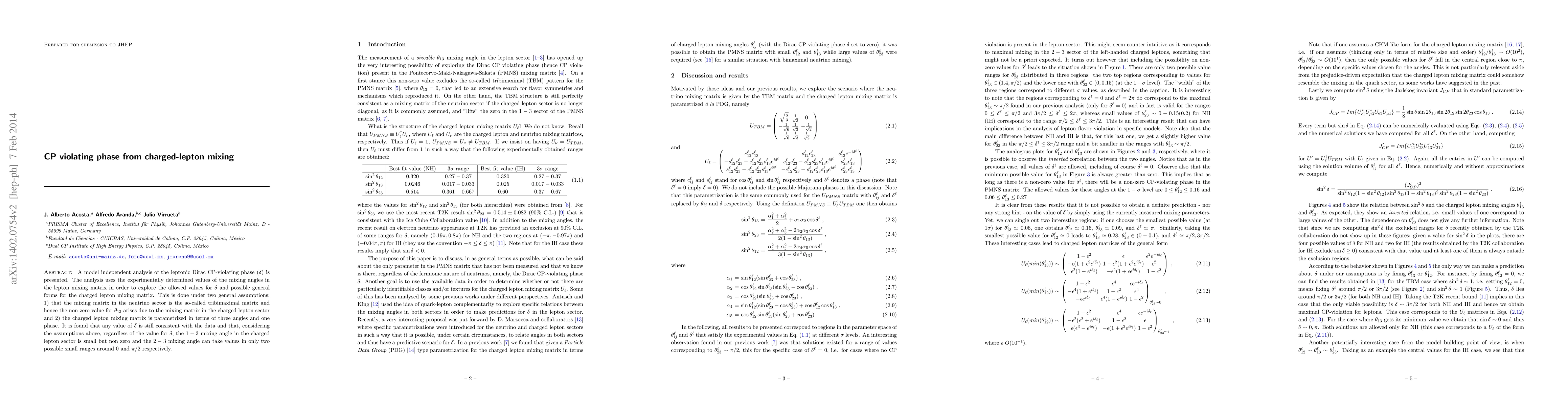 This paper conducts a model-independent analysis to explore the leptonic Dirac CP-violating phase (\(\delta\)) using experimentally determined lepton mixing angles. It finds that any value of \(\delta\) is consistent with data, and under specified assumptions, the 1-3 mixing angle in the charged lepton sector is small but non-zero, while the 2-3 mixing angle is constrained to two small ranges around 0 and \(\pi/2\).