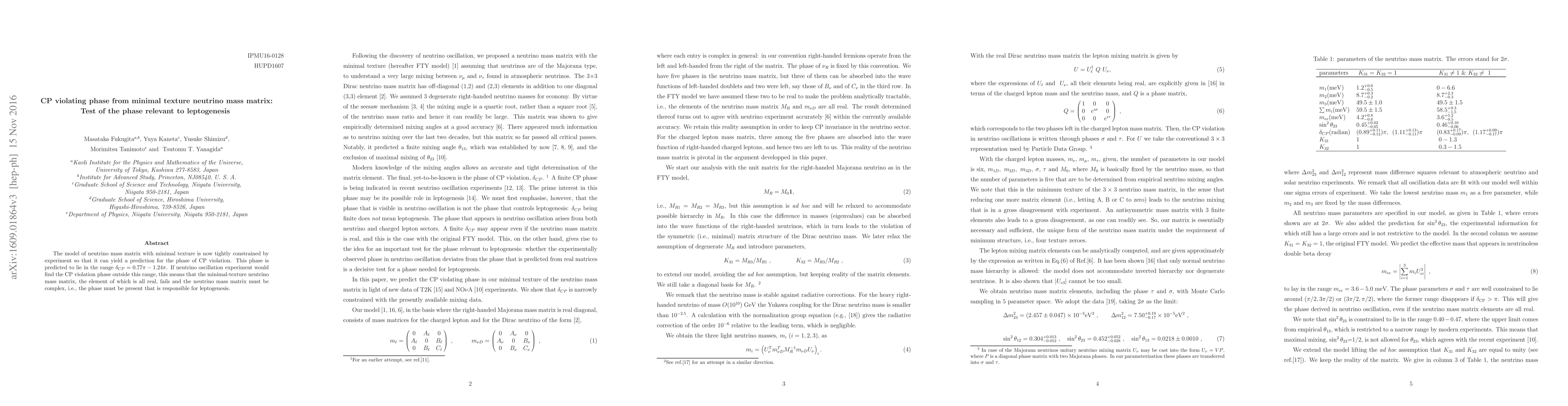 Two-line summary: The paper explores the CP violating phase predicted by a minimal texture neutrino mass matrix and finds it lies in the range $\delta_{CP}=0.77\pi - 1.24\pi$. If experiments detect a phase outside this range, it would indicate the need for a complex neutrino mass matrix, introducing a phase relevant to leptogenesis.