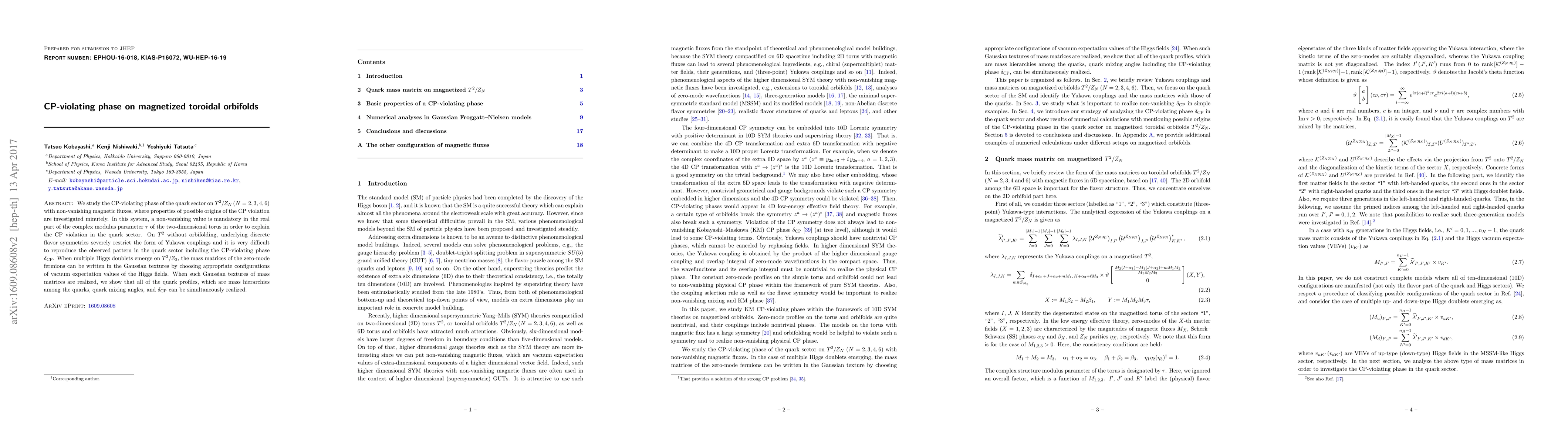 We study the CP-violating phase of the quark sector in the $U(8)$ flavor model on $T^2/Z_N \, (N=2,3,4,6)$ with non-vanishing magnetic fluxes, where properties of possible origins of the CP violation are investigated minutely. In this system, a non-vanishing value is mandatory in the real part of the complex modulus parameter $\tau$ of the two-dimensional torus. On $T^2$ without orbifolding, underlying discrete flavor symmetries severely restrict the form of Yukawa couplings and it is very difficult to reproduce the observed pattern in the quark sector including the CP-violating phase $\delta_{\rm CP}$. In cases of multiple Higgs doublets emerging on $T^2/Z_2$, the mass matrices of the zero-mode fermions can be written in the Gaussian textures by choosing appropriate configurations of vacuum expectation values of the Higgs fields. When such Gaussian textures of mass matrices are realized, we show that all of the quark profiles, which are mass hierarchies among the quarks, quark mixing angles, and $\delta_{\rm CP}$ can be simultaneously realized.
