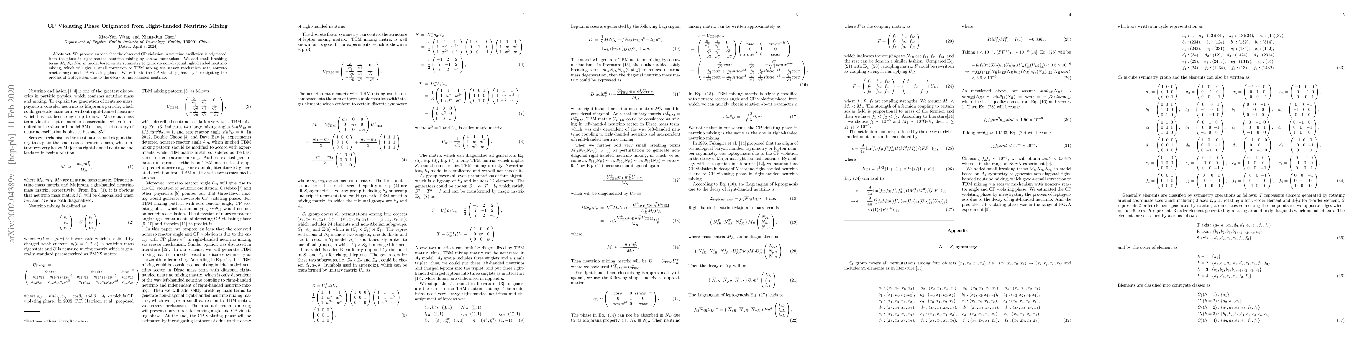 We propose an idea that the observed CP violation in neutrino oscillation is originated from the phase in right-handed neutrino mixing by seesaw mechanism. We add small breaking terms $M_{ij}N_{R_i}N_{R_j} $ in model based on $A_4$ symmetry to generate non-diagonal right-handed neutrino mixing, which will give a small correction to TBM mixing via seesaw mechanism with nonzero reactor angle and CP violating phase. We estimate the CP violating phase by investigating the process of leptogenesis due to the decay of right-handed neutrino.