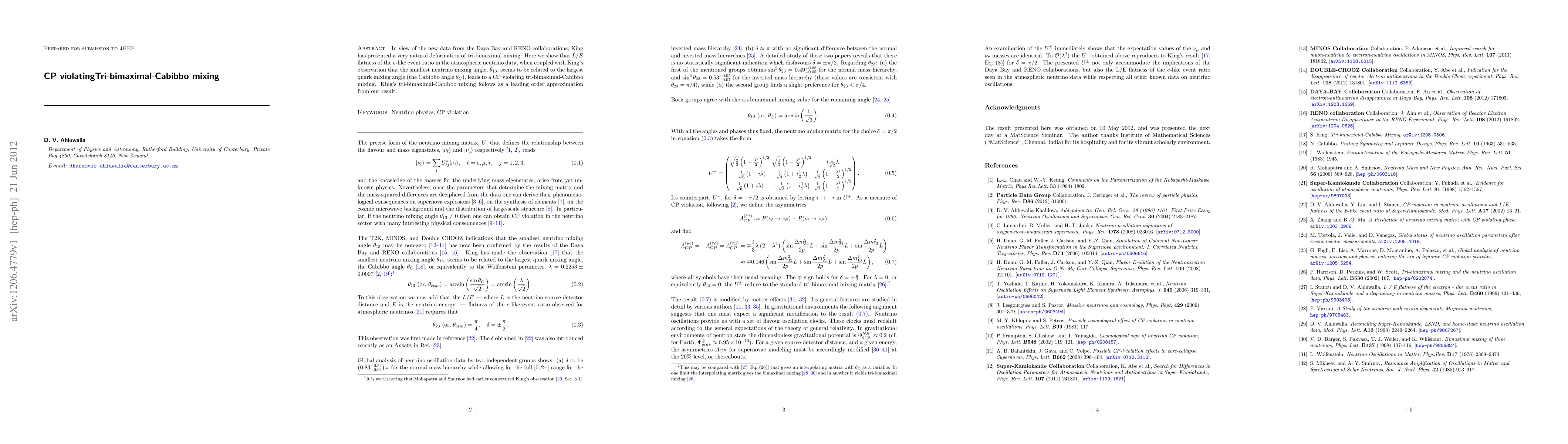 The research builds upon King's observation relating the smallest neutrino mixing angle (θ13) to the largest quark mixing angle (Cabibbo angle θC), and utilizes L/E flatness of the e-like event ratio in atmospheric neutrino data to derive a CP-violating tri-bimaximal-Cabibbo mixing.