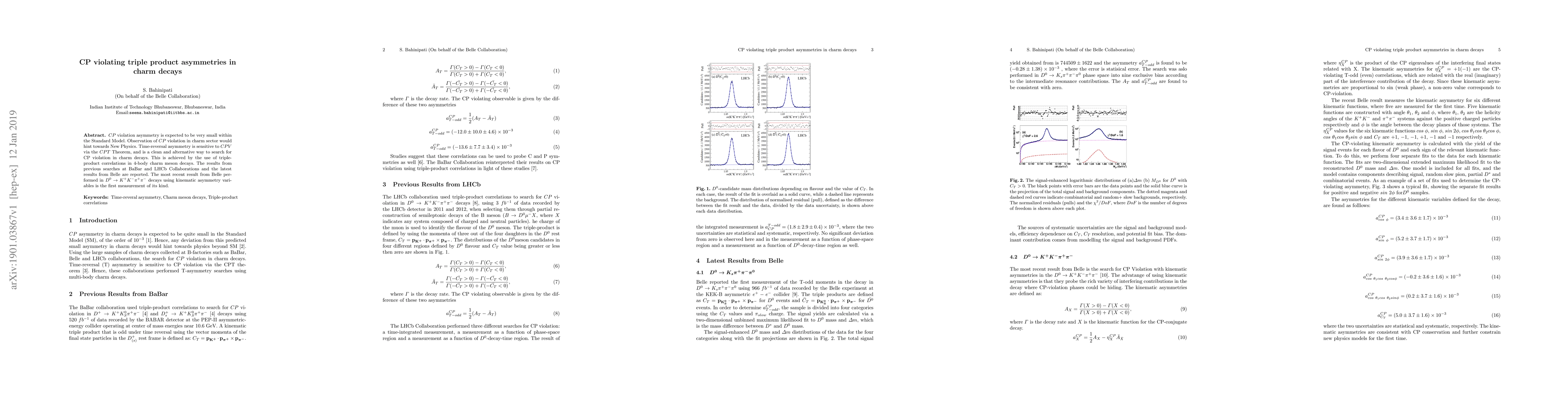$CP$ violation asymmetry is expected to be very small within the Standard Model. Observation of $CP$ violation in charm sector would hint towards New Physics. Time-reversal asymmetry is sensitive to $CPV$ via the $CPT$ Theorem, and is a clean and alternative way to search for CP violation in charm decays. This is achieved by the use of triple-product correlations in 4-body charm meson decays. The results from previous searches at BaBar and LHCb Collaborations and the latest results from Belle are reported. The most recent result from Belle performed in $D^{0} \to K^{+}K^{-}\pi^{+}\pi^{-}$ decays using kinematic asymmetry variables is the first measurement of its kind.