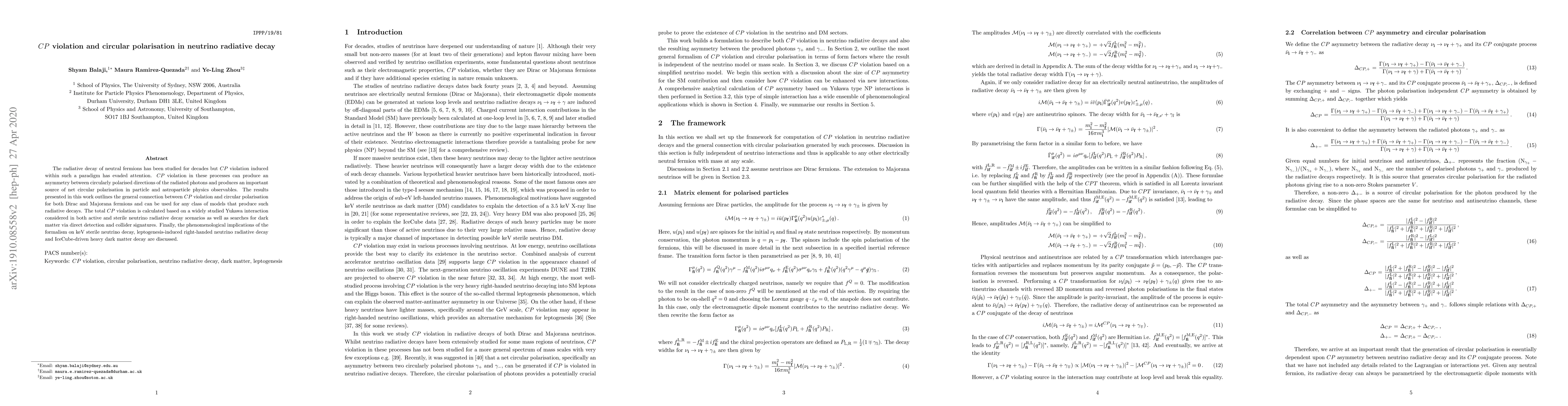 This paper investigates $CP$ violation in the radiative decay of neutral fermions, demonstrating its connection to circular polarisation of emitted photons. It explores implications for both Dirac and Majorana neutrinos, and discusses potential phenomenological consequences in scenarios involving sterile neutrino decay, leptogenesis, and dark matter.