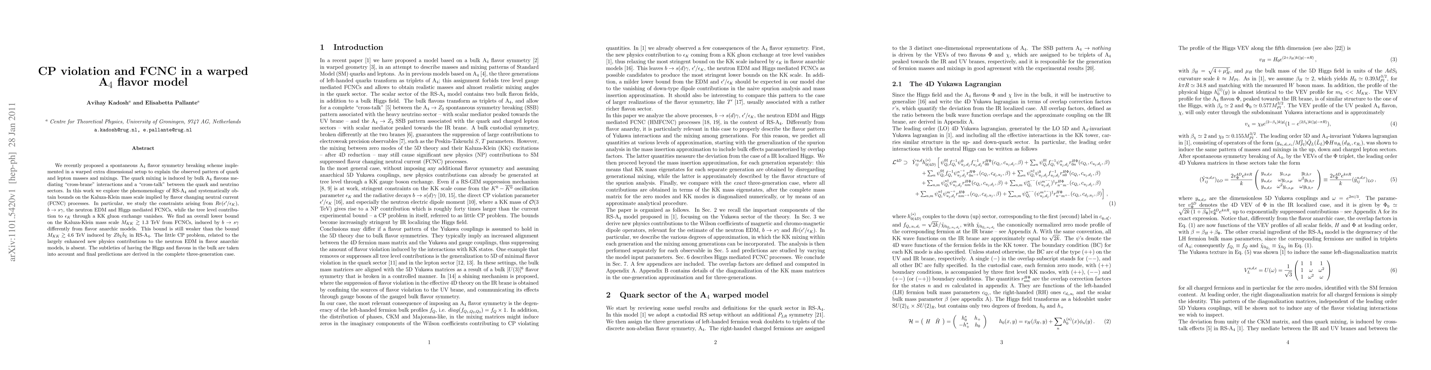 We recently proposed a spontaneous A4 flavor symmetry breaking scheme implemented in a warped extra dimensional setup to explain the observed pattern of quark and lepton masses and mixings. The quark mixing is induced by bulk A4 flavons mediating "cross-brane" interactions and a "cross-talk" between the quark and neutrino sectors. In this work we explore the phenomenology of RS-A4 and systematically obtain bounds on the Kaluza-Klein (KK) mass scale implied by flavor changing neutral current (FCNC) processes. In particular, we study the constraints arising from Re(\epsilon'/\epsilon_K), b->s\gamma, the neutron EDM and Higgs mediated FCNCs, while the tree level contribution to \epsilon_K through a KK gluon exchange vanishes. We find an overall lower bound on the Kaluza-Klein mass scale M_{KK} > 1.3 TeV from FCNCs, induced by b->s\gamma, differently from flavor anarchic models. This bound is still weaker than the bound M_{KK} > 4.6 TeV induced by Zb_L\bar{b}_L in RS-A4. The little CP problem, related to the largely enhanced new physics contributions to the neutron EDM in flavor anarchic models, is absent. The subtleties of having the Higgs and flavons in the bulk are taken into account and final predictions are derived in the complete three-generation case.