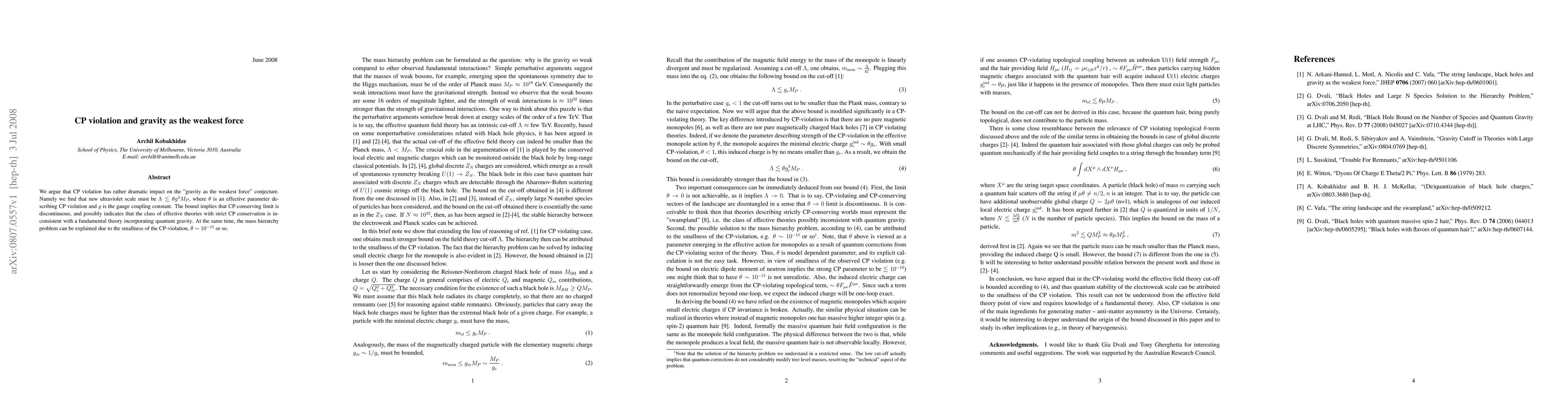 This paper argues that CP violation significantly impacts the "gravity as the weakest force" conjecture, suggesting a new ultraviolet scale bound. It implies that strict CP conservation may be inconsistent with a quantum gravity theory, while the smallness of CP violation helps explain the mass hierarchy problem.