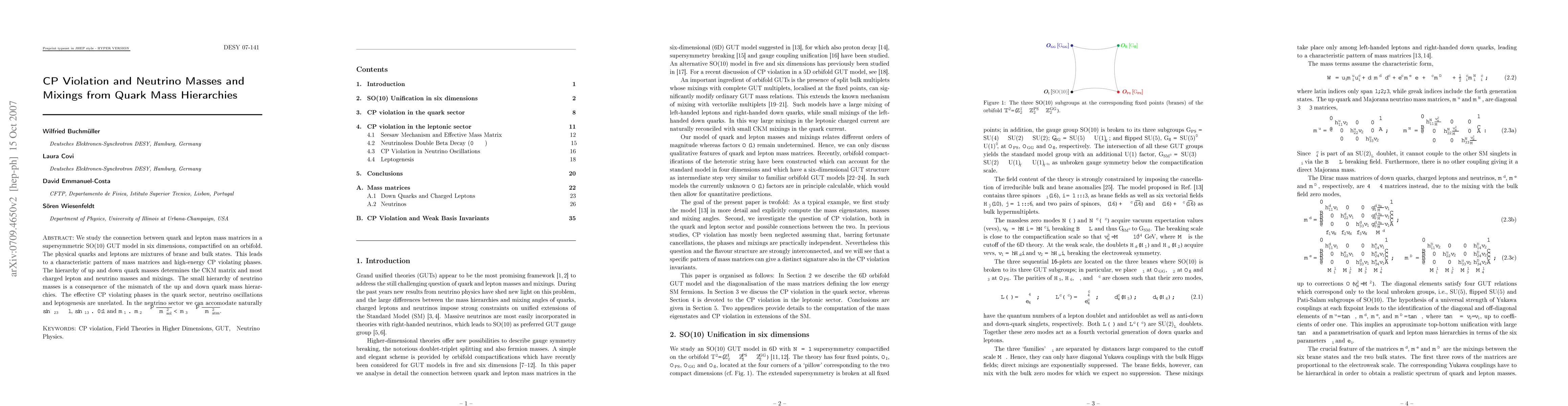 We study the connection between quark and lepton mass matrices in a supersymmetric SO(10) GUT model in six dimensions, compactified on an orbifold. The physical quarks and leptons are mixtures of brane and bulk states. This leads to a characteristic pattern of mass matrices and high-energy CP violating phases. The hierarchy of up and down quark masses determines the CKM matrix and most charged lepton and neutrino masses and mixings. The small hierarchy of neutrino masses is a consequence of the mismatch of the up and down quark mass hierarchies. The effective CP violating phases in the quark sector, neutrino oscillations and leptogenesis are unrelated. In the neutrino sector we can accomodate naturally $\sin \theta_{23} \sim 1$, $\sin \theta_{13} \lesssim 0.1$ and $m_1 \lesssim m_2 \sim \sqrt{\Delta m^2_\text{sol}} < m_3 \sim \sqrt{\Delta m^2_\text{atm}}$.