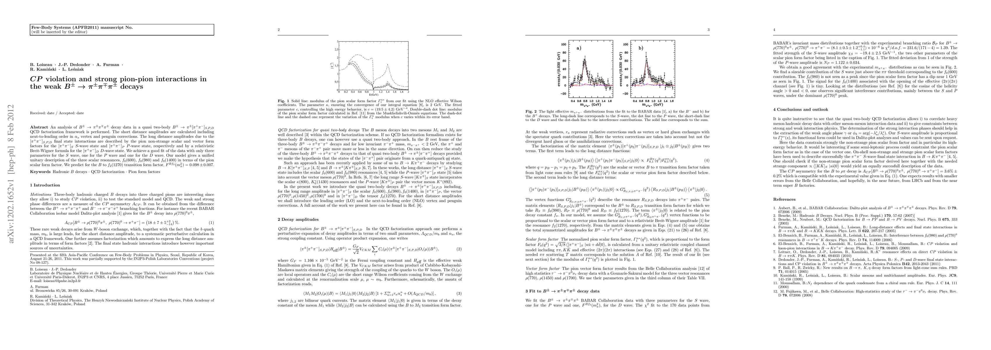 An analysis of charged B decay data in a quasi two-body decay into a charged pion plus a S, P,or D state of two charged pions is performed in the QCD factorization framework. The short distance amplitudes are calculated including next-to-leading order corrections in the strong coupling constant for vertex and penguin contributions. The long distance amplitudes due to the two charged pion final state interactions are described by the pion non-strange scalar and vector form factors for the two-pion S- and P-wave states, respectively and by a relativistic Breit-Wigner formula for the D-wave state. We achieve a good fit of the data with only three parameters for the S wave, one for the P wave and one for the D wave. Our model gives a unified unitary description of the three scalar resonances, f_0(600), f_0(980) and f_0(1400) in terms of the pion scalar form factor. We predict for the B to f_2(1270) transition form factor a value of 0.098+-0.007 at a momentum transfer square equal to the pion-mass square.