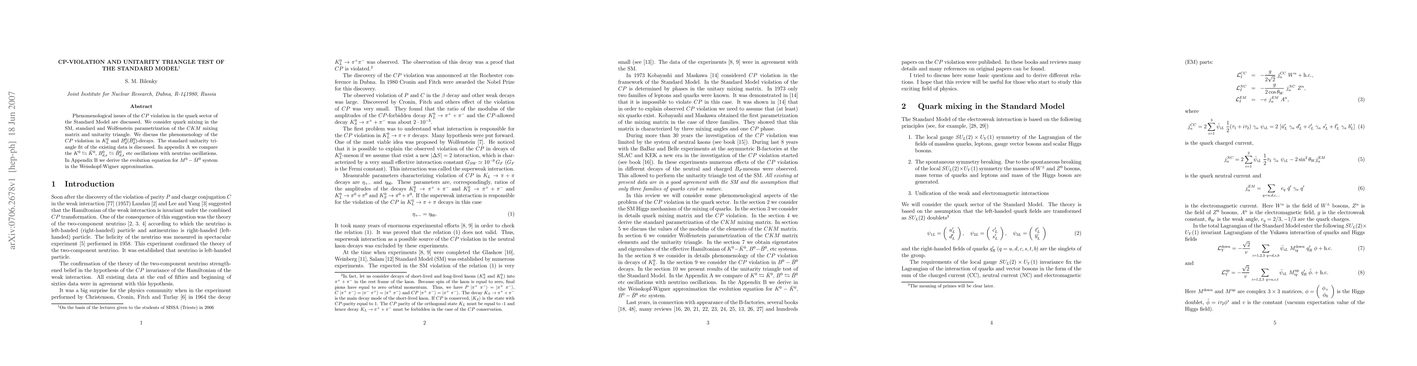 Phenomenological issues of the CP violation in the quark sector of the Standard Model are discussed. We consider quark mixing in the SM, standard and Wolfenstein parametrization of the $CKM$ mixing matrix and unitarity triangle. We discuss the phenomenology of the CP violation in $K^{0}_{L}$ and $B_{d}^{0} (\bar B_{d}^{0})$-decays. The standard unitarity triangle fit of the existing data is discussed. In appendix A we compare the $K^{0}\leftrightarrows \bar K^{0}$, $B_{d,s}^{0}\leftrightarrows \bar B^{0}_{d,s}$ etc oscillations with neutrino oscillations. In Appendix B we derive the evolution equation for $M^{0}- \bar M^{0}$ system in the Weisskopf-Wigner approximation.