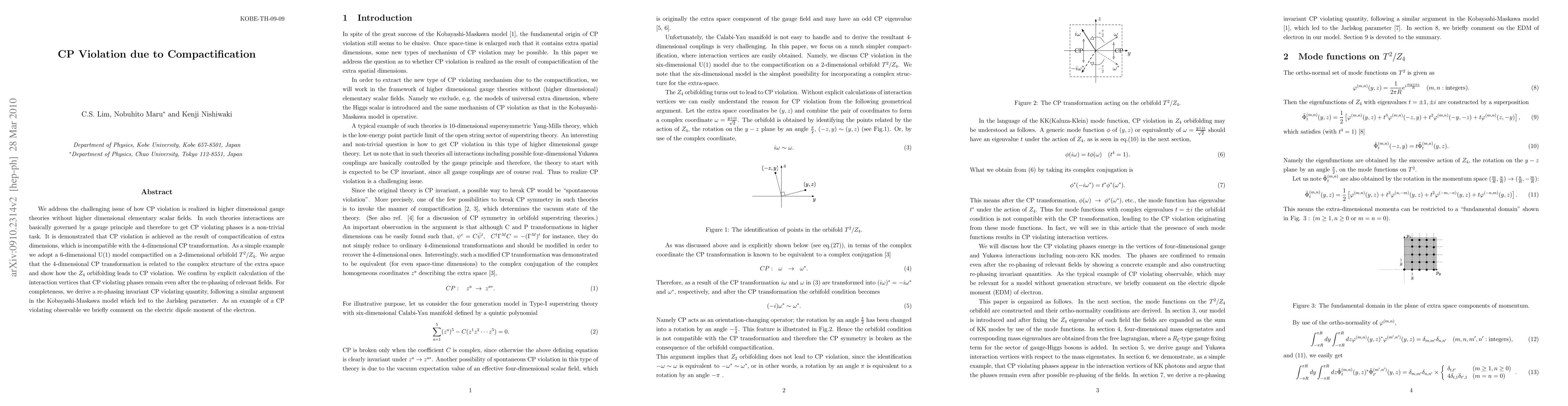 This paper explores how CP violation can arise in higher-dimensional gauge theories without higher-dimensional scalar fields, demonstrating that compactification of extra dimensions can introduce CP-violating phases incompatible with 4-dimensional CP transformations. It uses a 6-dimensional U(1) model on a $T^{2}/Z_{4}$ orbifold to show that $Z_{4}$ orbifolding leads to CP violation, confirmed by explicit calculations of interaction vertices.
