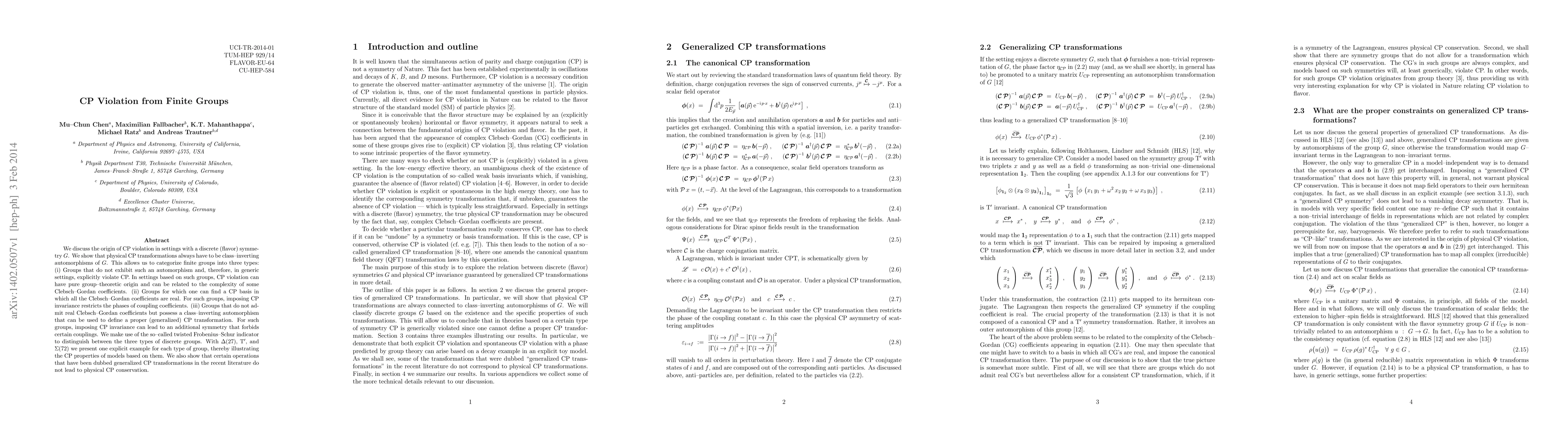 We discuss the origin of CP violation in settings with a discrete (flavor) symmetry $G$. We show that physical CP transformations always have to be class-inverting automorphisms of $G$. This allows us to categorize finite groups into three types: (i) Groups that do not exhibit such an automorphism and, therefore, in generic settings, explicitly violate CP. In settings based on such groups, CP violation can have pure group-theoretic origin and can be related to the complexity of some Clebsch-Gordan coefficients. (ii) Groups for which one can find a CP basis in which all the Clebsch-Gordan coefficients are real. For such groups, imposing CP invariance restricts the phases of coupling coefficients. (iii) Groups that do not admit real Clebsch-Gordan coefficients but possess a class-inverting automorphism that can be used to define a proper (generalized) CP transformation. For such groups, imposing CP invariance can lead to an additional symmetry that forbids certain couplings. We make use of the so-called twisted Frobenius-Schur indicator to distinguish between the three types of discrete groups. With $\Delta(27)$, $T^{\prime}$, and $\Sigma(72)$ we present one explicit example for each type of group, thereby illustrating the CP properties of models based on them. We also show that certain operations that have been dubbed generalized CP transformations in the recent literature do not lead to physical CP conservation.