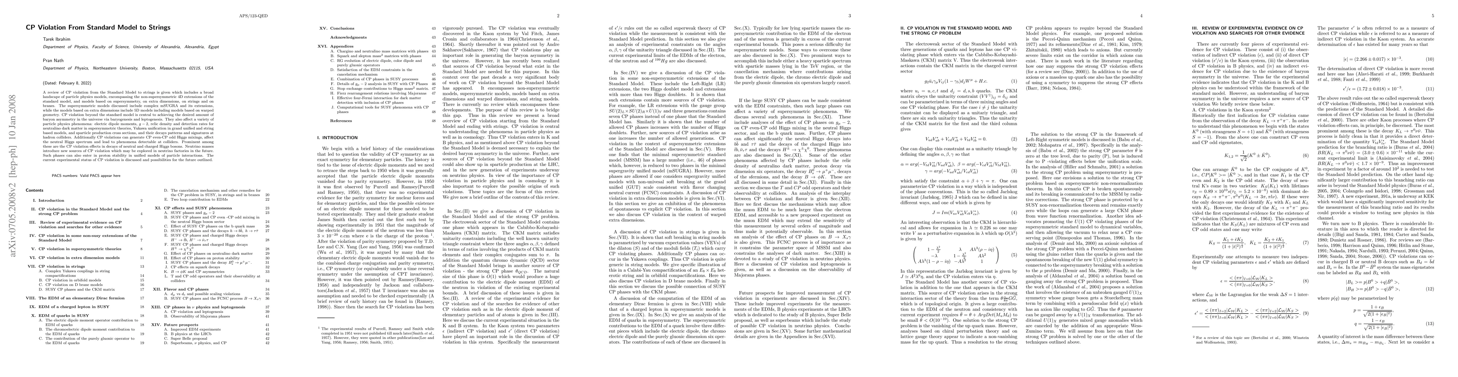 A review of CP violation from the Standard Model to strings is given which includes a broad landscape of particle physics models, encompassing the non-supersymmetric 4D extensions of the standard model, and models based on supersymmetry, on extra dimensions, on strings and on branes. The supersymmetric models discussed include complex mSUGRA and its extensions, while the models based on extra dimensions include 5D models including models based on warped geometry. CP violation beyond the standard model is central to achieving the desired amount of baryon asymmetry in the universe via baryogenesis and leptogenesis. They also affect a variety of particle physics phenomena: electric dipole moments, $g-2$, relic density and detection rates for neutralino dark matter in supersymmetric theories, Yukawa unification in grand unified and string based models, and sparticle production cross sections, and their decays patterns and signatures at hadron colliders. Additionally CP violations can generate CP even-CP odd Higgs mixings, affect the neutral Higgs spectrum and lead to phenomena detectable at colliders. Prominent among these are the CP violation effects in decays of neutral and charged Higgs bosons. Neutrino masses introduce new sources of CP violation which will be explored in neutrino factories in the future. Such phases can also enter in proton stability in unified models of particle interactions. The current experimental status of CP violation is discussed and possibilities for the future outlined.