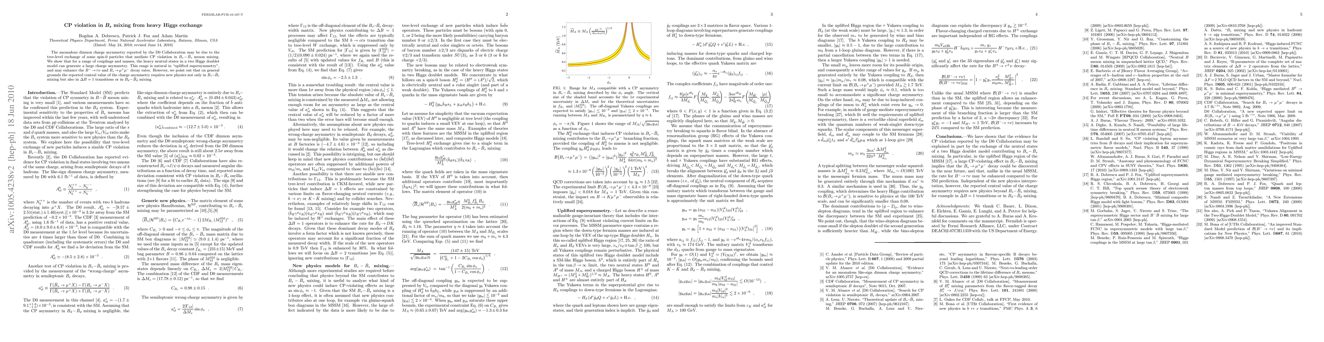 The anomalous dimuon charge asymmetry reported by the D0 Collaboration may be due to the tree-level exchange of some spin-0 particles that mediate CP violation in B_s-\bar{B}_s meson mixing. We show that for a range of couplings and masses, the heavy neutral states in a two Higgs doublet model can generate a large charge asymmetry. This range is natural in "uplifted supersymmetry", and may enhance the B^- -> tau nu and B_s -> mu^+ mu^- decay rates. However, we point out that on general grounds the reported central value of the charge asymmetry requires new physics not only in B_s-\bar{B}_s mixing but also in \Delta B = 1 transitions or in B_d-\bar{B}_d mixing.
