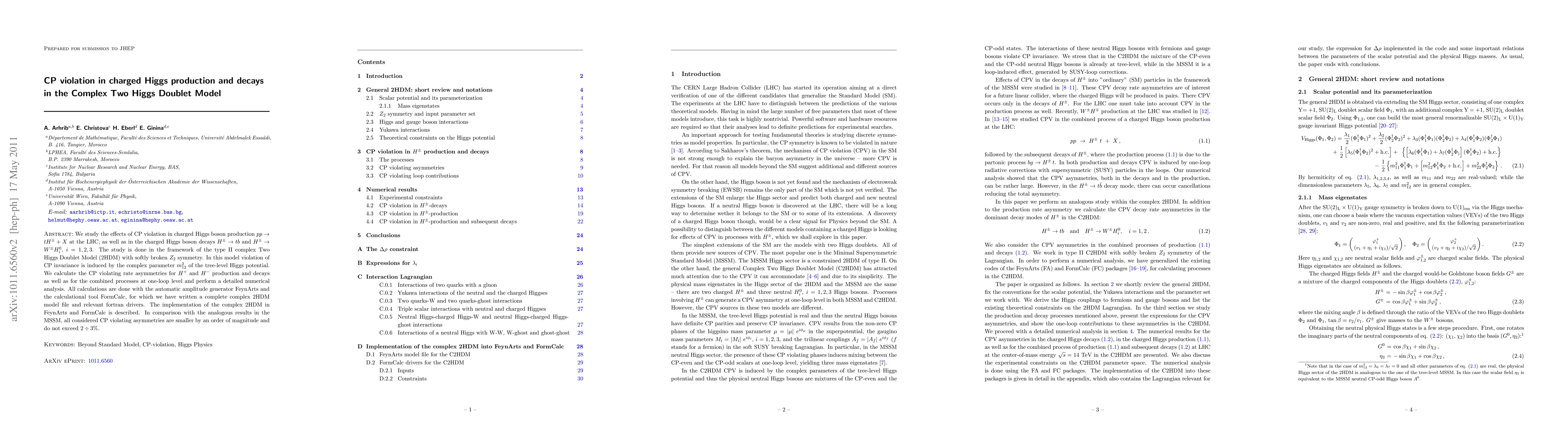 We study the effects of CP violation in charged Higgs boson production $pp\to t H^\pm + X$ at the LHC, as well as in the charged Higgs boson decays $H^\pm \to t b$ and $H^\pm \to W^\pm H_i^0$, $i=1,2,3$. The study is done in the framework of the type II complex Two Higgs Doublet Model (2HDM) with softly broken $Z_2$ symmetry. In this model violation of CP invariance is induced by the complex parameter $m^2_{12}$ of the tree-level Higgs potential. We calculate the CP violating rate asymmetries for $H^+$ and $H^-$ production and decays as well as for the combined processes at one-loop level and perform a detailed numerical analysis. All calculations are done with the automatic amplitude generator FeynArts and the calculational tool FormCalc, for which we have written a complete complex 2HDM model file and relevant fortran drivers. The implementation of the complex 2HDM in FeynArts and FormCalc is described. In comparison with the analogous results in the MSSM, all considered CP violating asymmetries are smaller by an order of magnitude and do not exceed 2 to 3%.