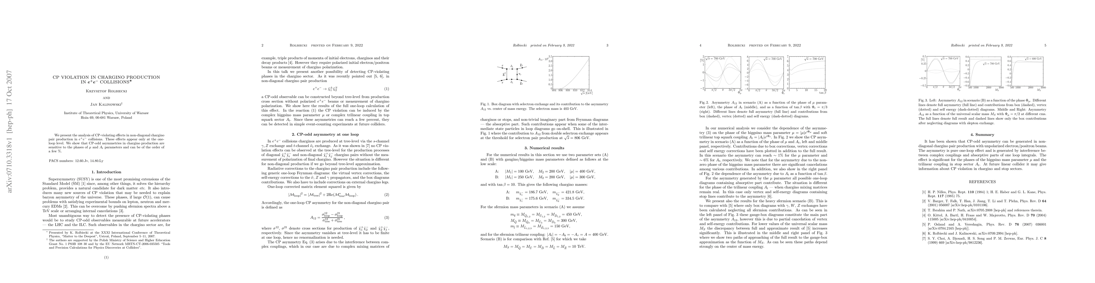 We present the analysis of CP-violating effects in non-diagonal chargino pair production in e+e- collisions. These effects appear only at the one-loop level. We show that CP-odd asymmetries in chargino production are sensitive to the phases of mu and A_t parameters and can be of the order of a few %.