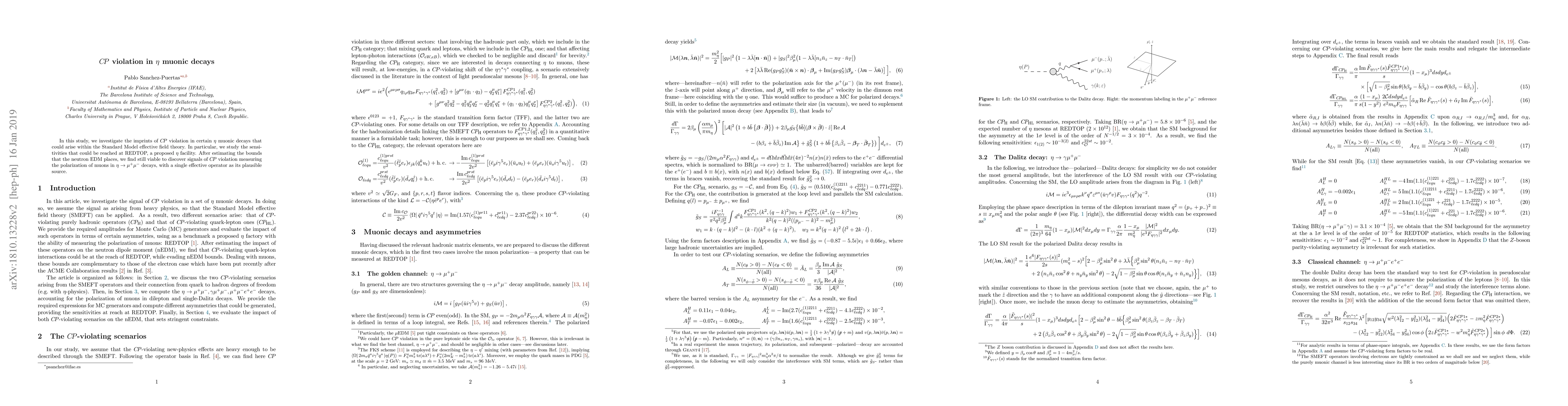 This paper explores $C\!P$ violation in $\eta$ muonic decays within the Standard Model framework, focusing on potential discoveries at the REDTOP facility. It finds that signals of $C\!P$ violation via muon polarization in $\eta\to\mu^+\mu^-$ decays remain detectable despite neutron EDM constraints.