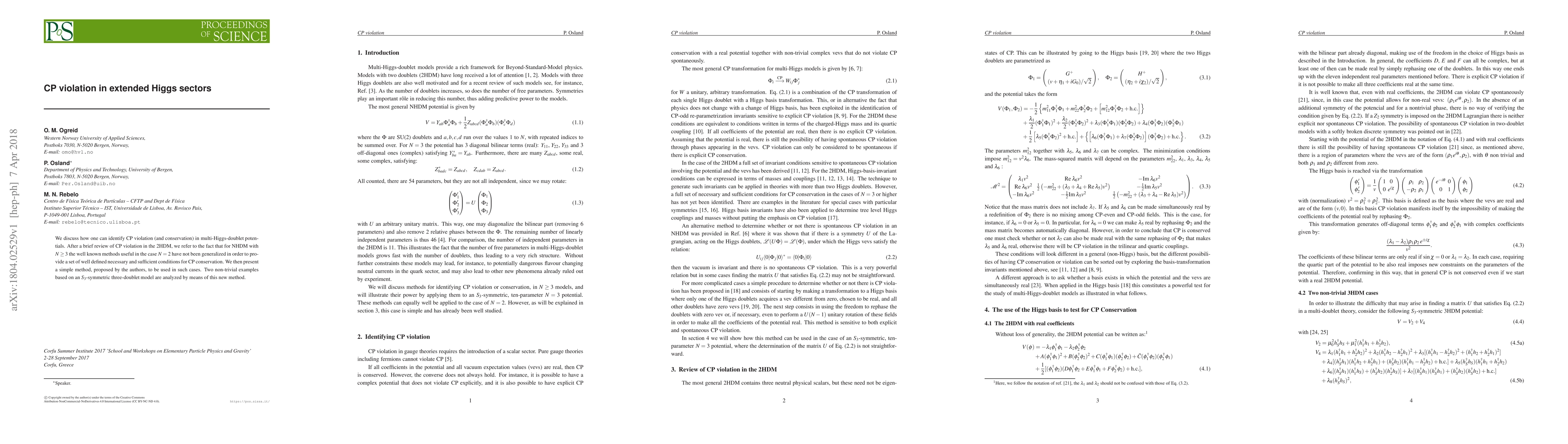 We discuss how one can identify CP violation (and conservation) in multi-Higgs-doublet potentials. After a brief review of CP violation in the 2HDM, we refer to the fact that for NHDM with $N \geq 3$ the well known methods useful in the case $N = 2$ have not been generalized in order to provide a set of well defined necessary and sufficient conditions for CP conservation. We then present a simple method, proposed by the authors, to be used in such cases. Two non-trivial examples based on an $S_3$-symmetric three-doublet model are analyzed by means of this new method.