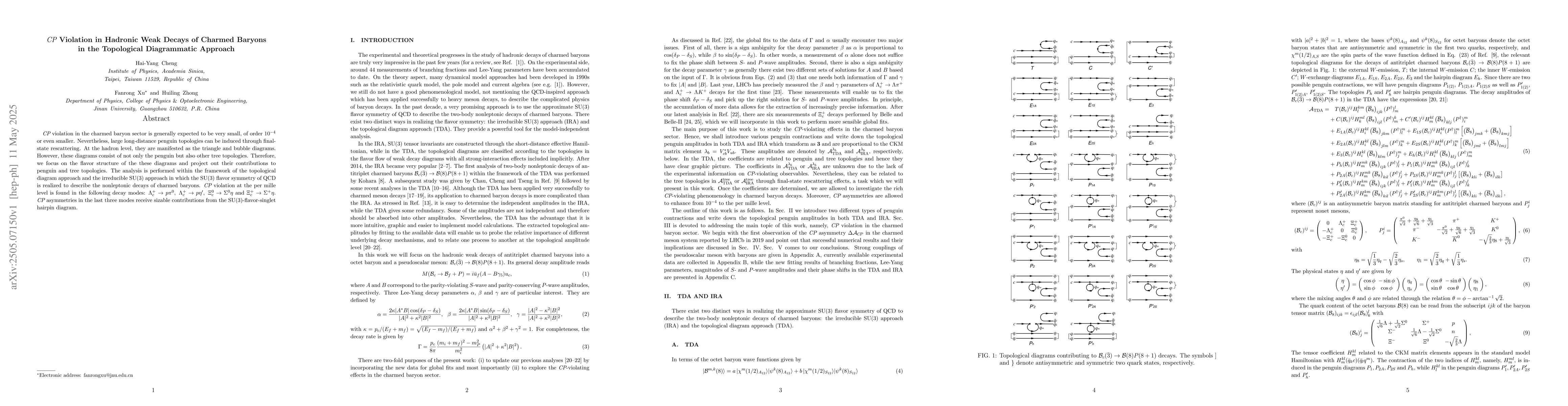 The paper presents a detailed analysis of CP violation in charmed baryon decays using topological diagrams, distinguishing penguin and tree contributions.